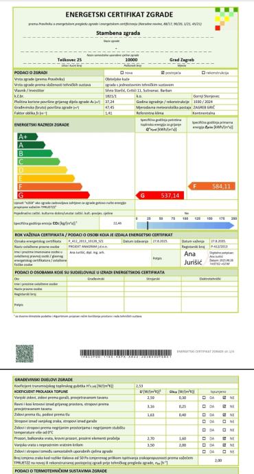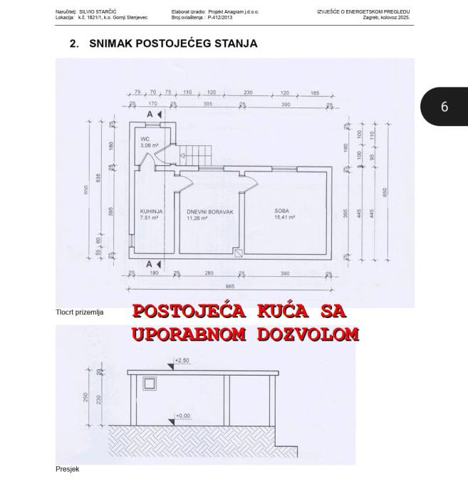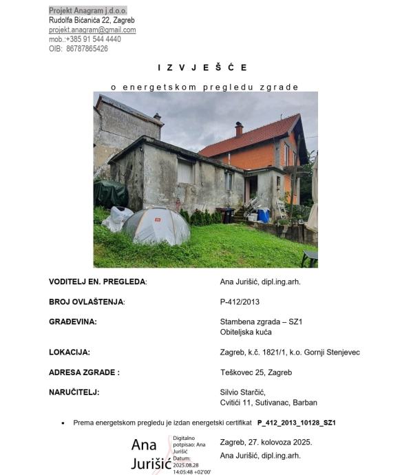 Građeno je 1938. na čvrstom tlu, po uzorku tla nakon 2m je lapor pa stijena. Uzorci su toliko čvrsti da još stoje na dvorištu u obliku valjka. U potresu nije bilo oštečenja na susjednim kućama, ima i snimka sa kamere za vrijeme potresa. Sa sjeverne strane je susjedna kuća od Sljemenskog kamena, još 100g starija na istom mjestu. Kuća je legalizirana 2014. po zakonu o građevinama prije 1968. u ovom obliku te placena naknada i sva davanja. U projektu legalizacije je i potporni zid na ulicu, dakle nema dodatne rezervacije proširenja za cestu. Teren je poravnan, i u rekonstrukciji značajnu uštedu donosi postojeci iskop i temelj.