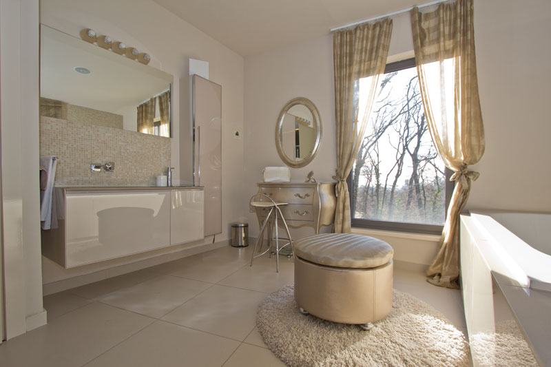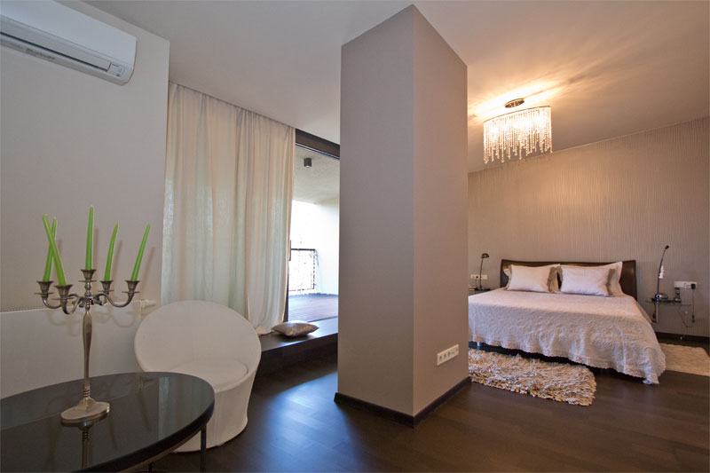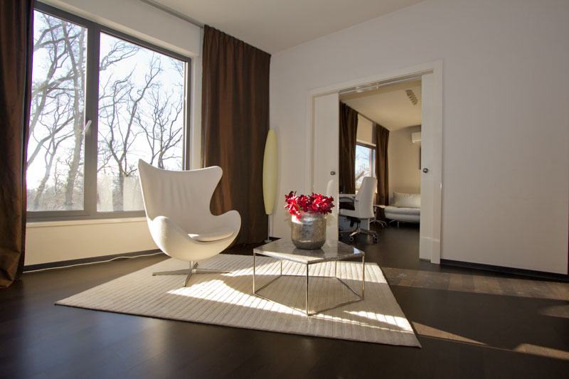 FIRST FLOOR: entrance hall, living room from which it goes into the bedroom (separate room, dressing room), bathroom. The second part leads to the master bedroom with balcony where a beautiful view at the green room, dressing room, spacious bathroom.
