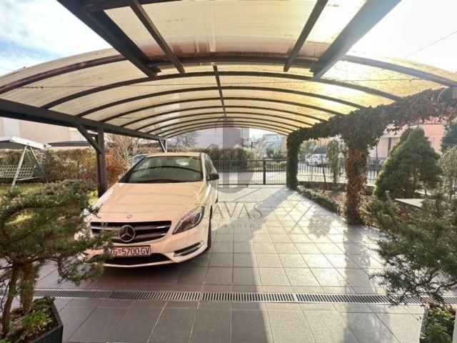 Kuća se nalazi na zemljištu od 300m2, okružena dvama parkirnim mjestima pod nadstrešnicom i prostranim vrtom.