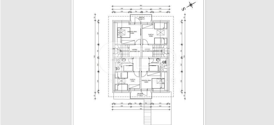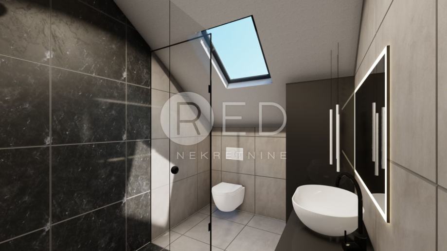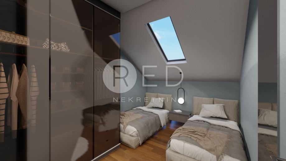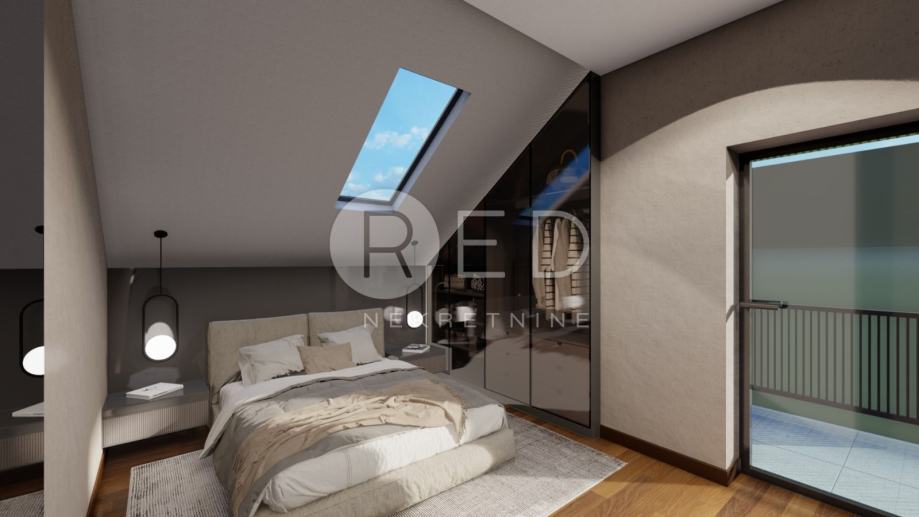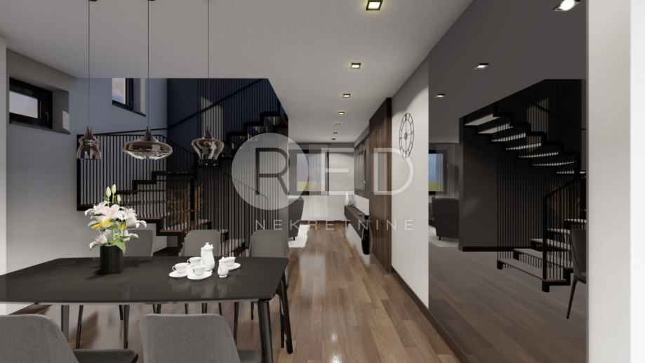 STAN 2 (1. kat i visoko potkrovlje) : Dnevni boravak, kuhinja i blagovaonica • Mali WC ispod stepenica • Terasa • 2 spavaće sobe i kupaonica u visokom potkrovlju • Balkon