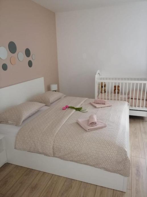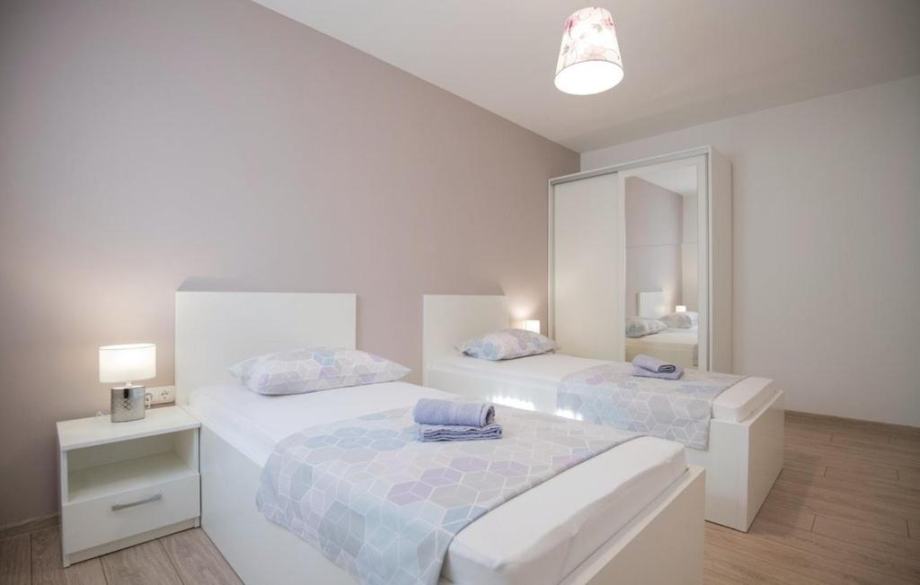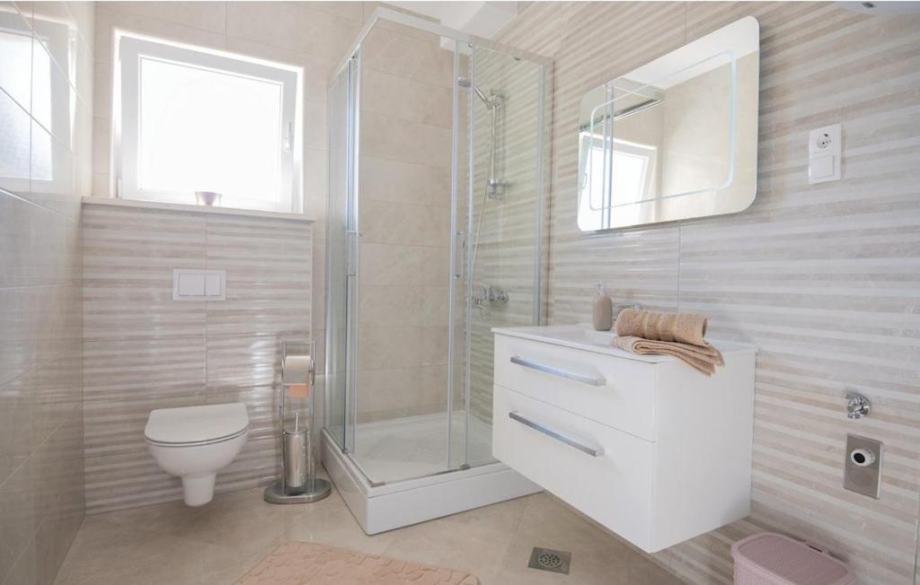 U donjoj etaži na kojoj se nalaze dvije sobe sa kupaonicama, te dio koji nije do kraja uređen, a predviđen je kao sobu za slobodno vrijeme ili garaža za dva automobila( ovisno o željama potencijalnog kupca).