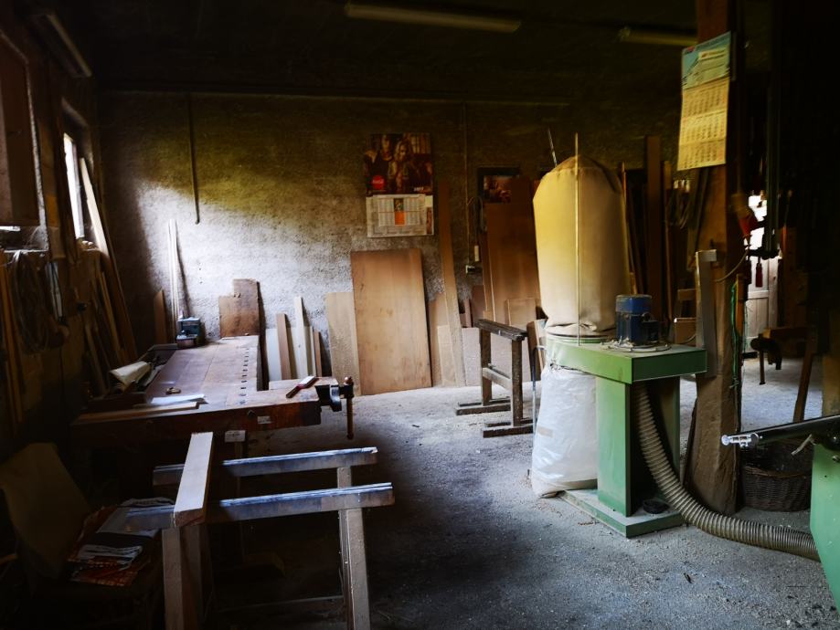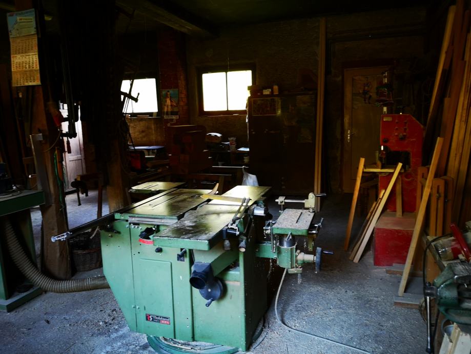 U dvorištu se na kuću nastavlja velika radiona sa kotlovnicom i garažom za jedan automobil te spremište.