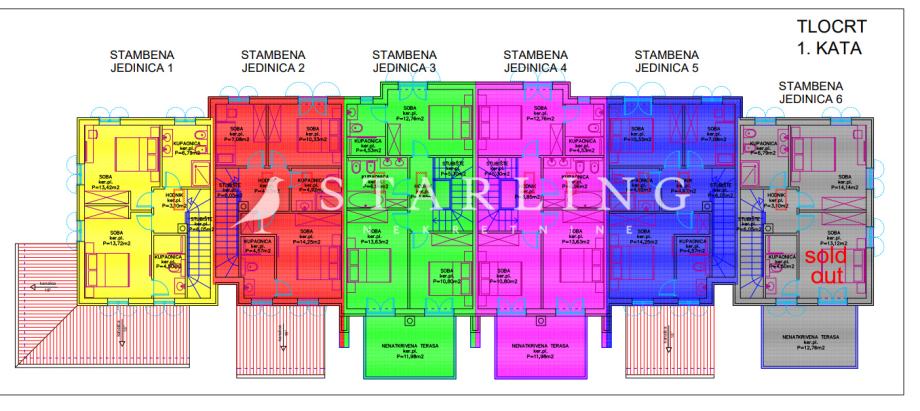 Stambena površina od 125 m² sastoji se od tri spavaće sobe s pripadajućim kupaonicama, praonice i spremišta. Kući pripada pokriveno parkirno mjesto br. 4 s pergolom. Posebnu vrijednost daje vrt površine 29 m² s privatnim sunčalištem.