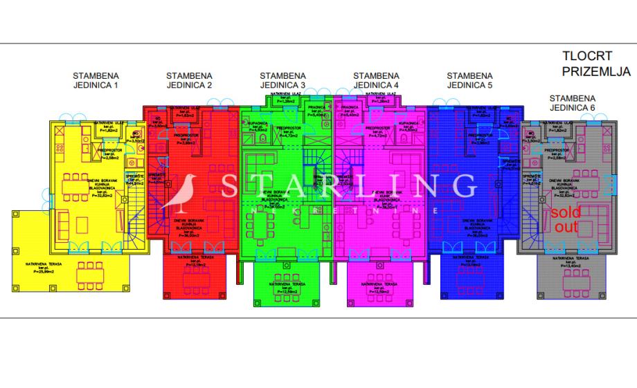 Uređena i popločena površina od 960 m² s dodatnim parkirnim mjestima i privatnim prilazima.