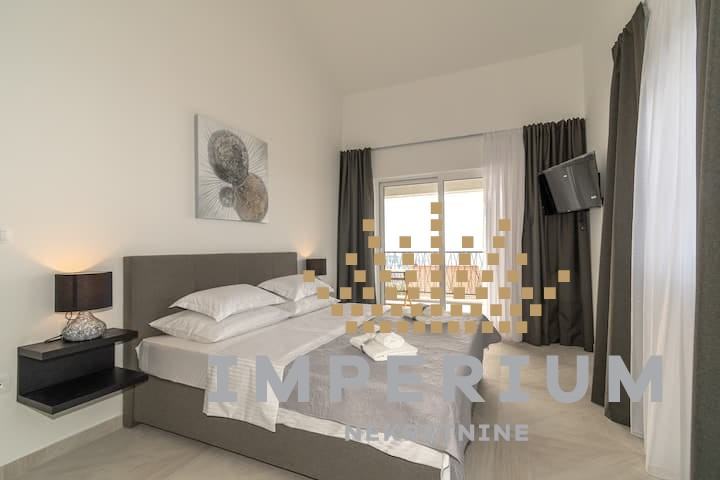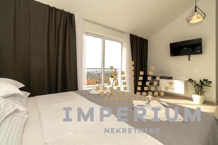 Treća etaža (1. kat): Tri elegantne spavaće sobe, svaka s privatnom kupaonicom i izlazom na balkon. Dvije sobe imaju prekrasan pogled na more, a treća na planinu.