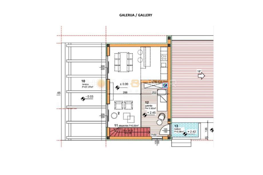 Kuća ima prizemlju ima ulazni hodnik, 2 spavaće sobe, kupaonicu sa WC-om, odvojeni WC, dnevni boravak otvorenog tipa sa kuhinjom i blagovaonom sa izlazom na veliku terasu, te galeriju površine oko 12m2.