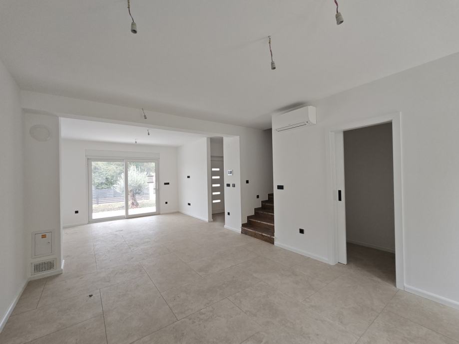 Kuća ima fasadu debljine 10 cm koja osigurava izvrsnu toplinsku izolaciju, dok troslojni PVC stakleni prozori dodatno povećavaju energetsku učinkovitost. Prilikom ulaska u kuću, dolazi se do prostranog hodnika koji vodi u svijetli dnevni boravak povezan s modernom kuhinjom i blagovaonicom. Veliki stakleni otvori u dnevnom boravku omogućuju izlaz na terasu i vrt te unose obilje prirodnog svjetla.