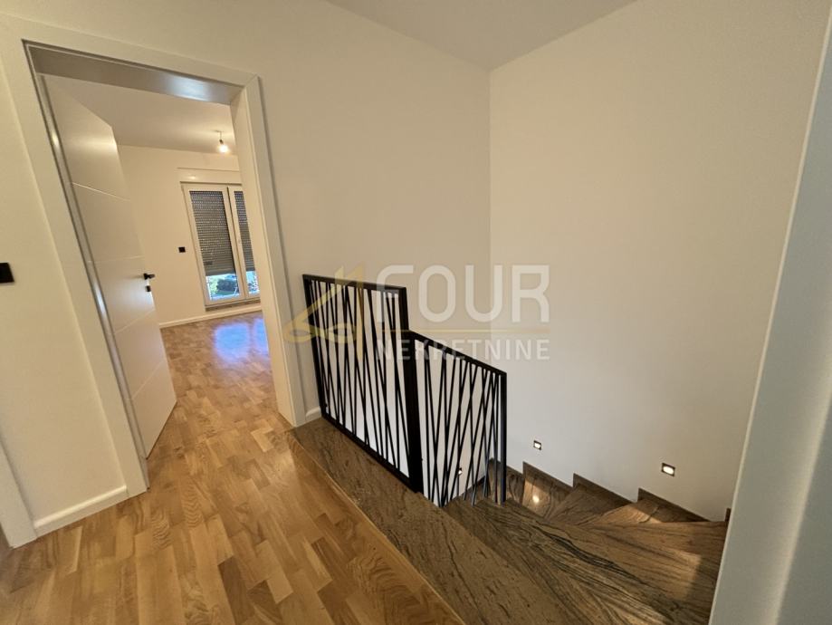 Kuća se prostire na okućnici od približno 200m2, koja uključuje uređen vrt i natkrivenu terasu. Prizemlje (67.34m2) se sastoji od ulaza, toaleta, prostranog dnevnog boravka s kuhinjom i blagovaonicom, spremišta, vanjskog spremišta te stubišta. Na prvom katu (59.94m2) nalaze se tri spavaće sobe, od kojih jedna ima vlastitu kupaonicu i izlaz na natkrivenu terasu, te kupaonica i hodnik.