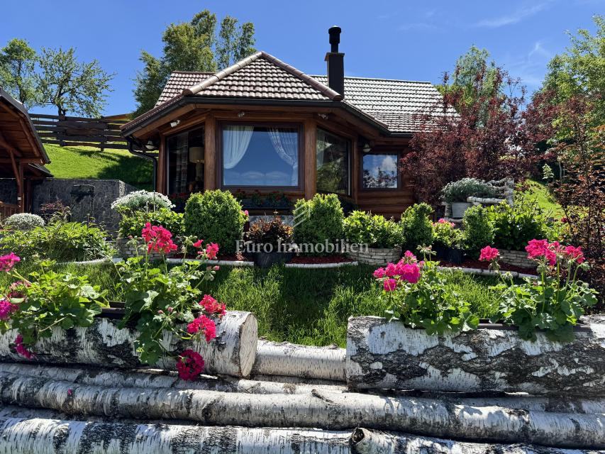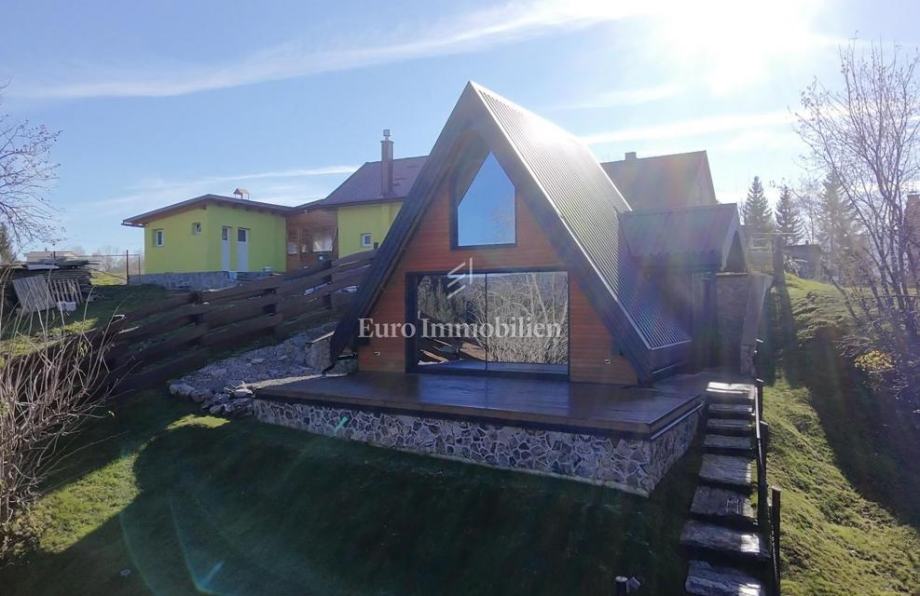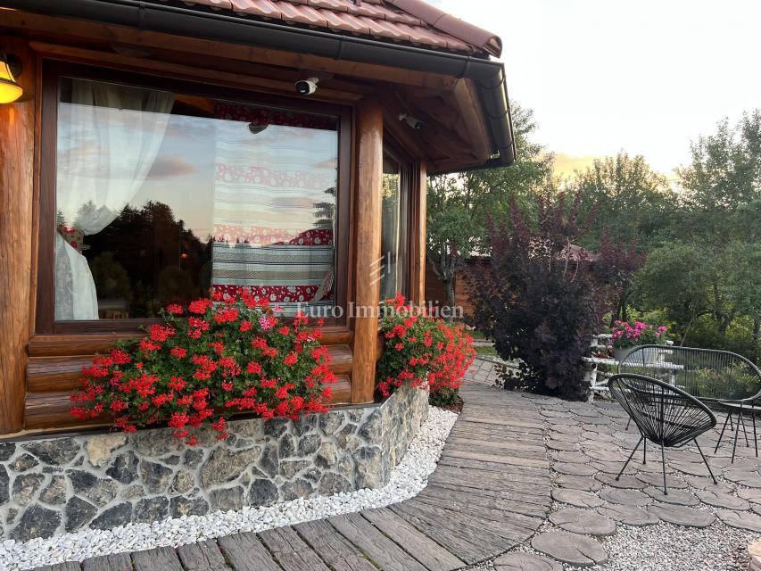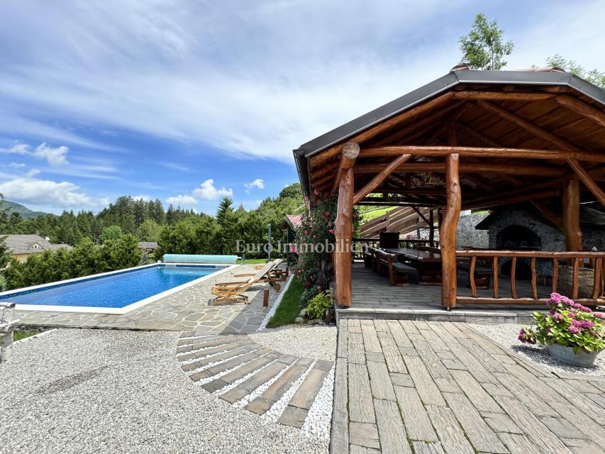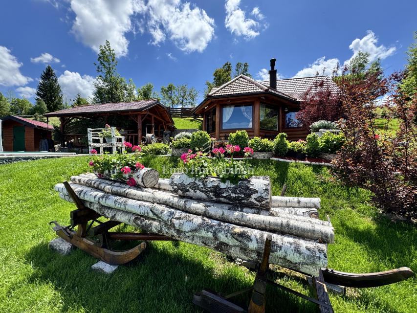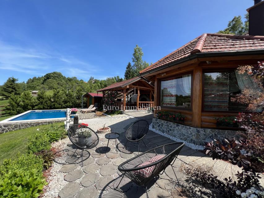 Ova nekretnina smještena je unutar velike, ograđene i uređene okućnice. Glavna kuća je drvena i potpuno namještena, a uz kuću se nalazi veliki natkriveni prostor za druženje s grillom. Ispred kuće smješten je bazen sa sunčalištem, idealan za uživanje u vanjskom prostoru. Drugi objekt na uzvišenju je wellness kuća koja nudi spektakularan pogled kroz staklene površine. Unutar wellness kuće smješteni su jacuzzi s ležaljkama i tušem, dok se na katu nalazi sauna za četiri osobe. Pored glavne kuće nalazi se manji gospodarski objekt koji može služiti kao garaža ili za smještaj potrebnih alata. Četvrti objekt je samostojeća kuća, katnica, koja trenutno nije u funkciji, ali pruža potencijal za daljnju prenamjenu. Veliki teren oko kuće nudi mogućnost dodatne izgradnje, jer je nekretnina smještena u građevinskoj zoni.