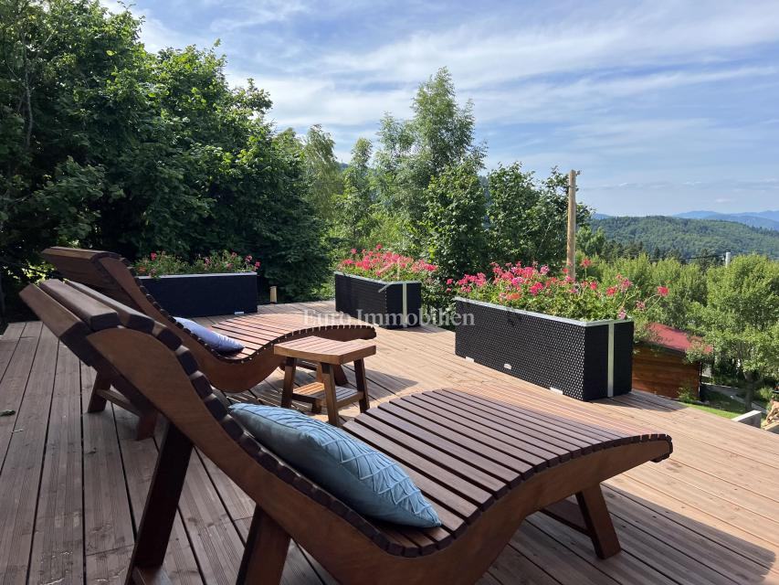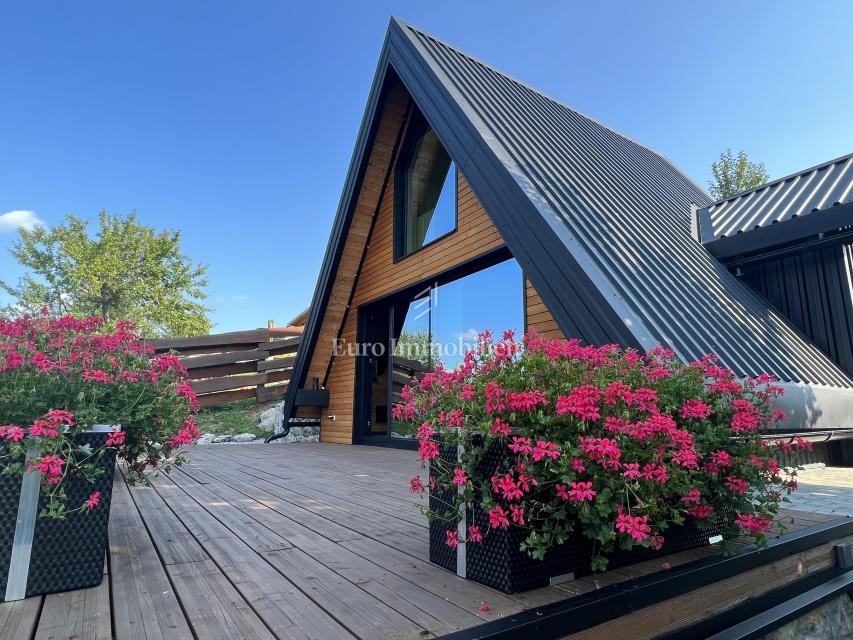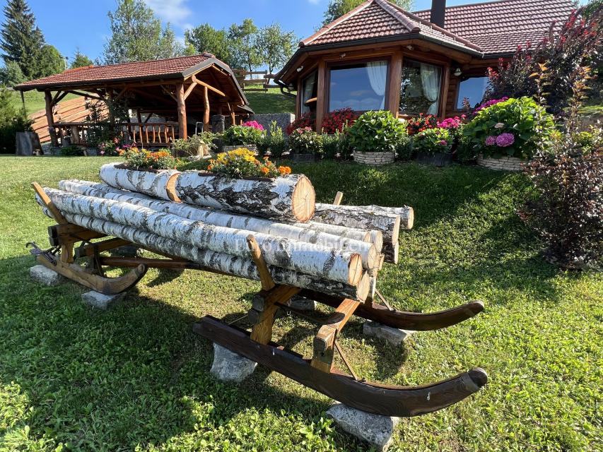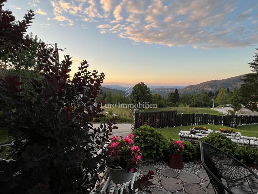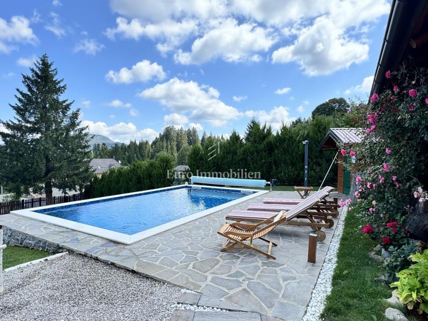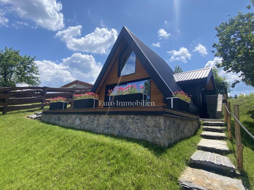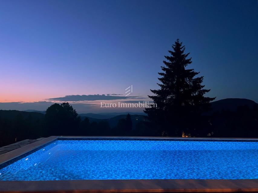 Ova nekretnina smještena je unutar velike, ograđene i uređene okućnice. Glavna kuća je drvena i potpuno namještena, a uz kuću se nalazi veliki natkriveni prostor za druženje s grillom. Ispred kuće smješten je bazen sa sunčalištem, idealan za uživanje u vanjskom prostoru. Drugi objekt na uzvišenju je wellness kuća koja nudi spektakularan pogled kroz staklene površine. Unutar wellness kuće smješteni su jacuzzi s ležaljkama i tušem, dok se na katu nalazi sauna za četiri osobe. Pored glavne kuće nalazi se manji gospodarski objekt koji može služiti kao garaža ili za smještaj potrebnih alata. Četvrti objekt je samostojeća kuća, katnica, koja trenutno nije u funkciji, ali pruža potencijal za daljnju prenamjenu. Veliki teren oko kuće nudi mogućnost dodatne izgradnje, jer je nekretnina smještena u građevinskoj zoni.