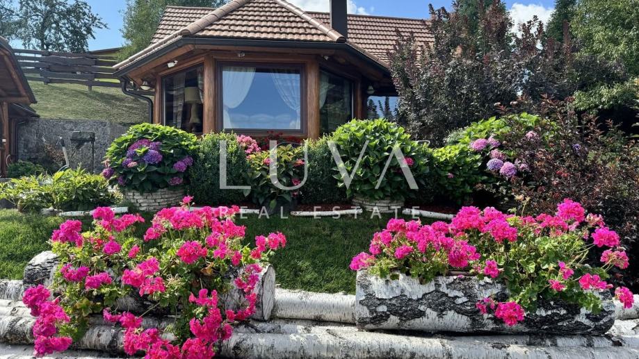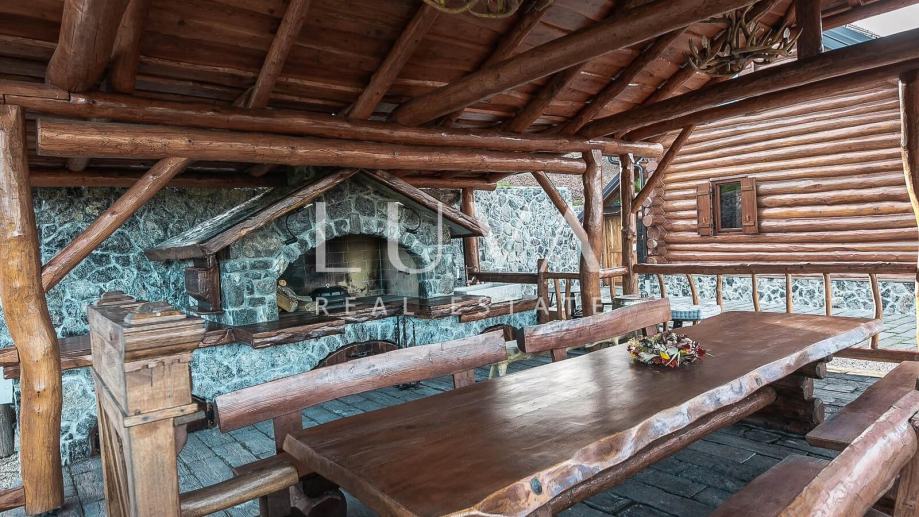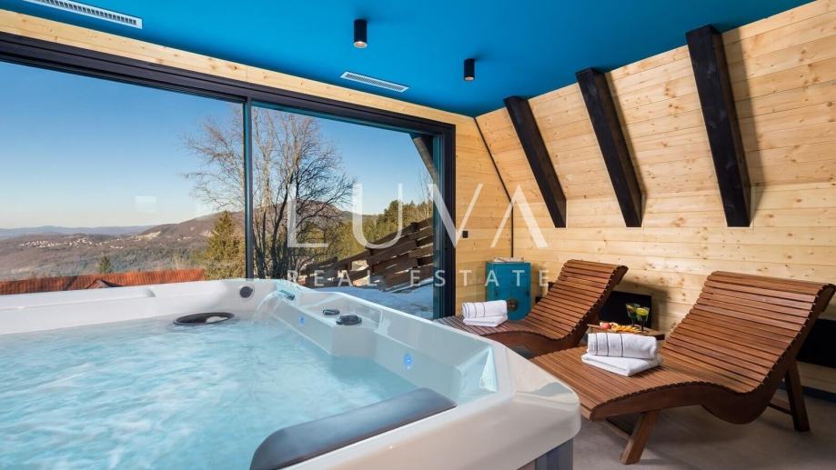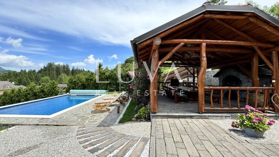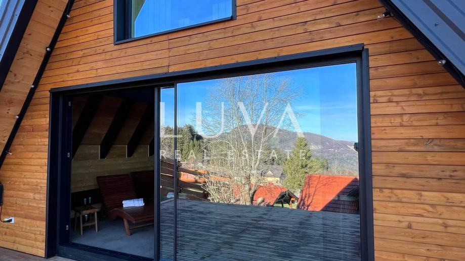 Na prostranom zemljištu od 1.600 m2 se osim kuće nalazi velika natkrivena terasa s roštiljem i dodatni objekt u kojem se nalaze Jacuzzi i sauna. Iz same kuće i dodatnog objekta sa saunom i Jacuzzi-jem se pruža predivan panoramski pogled na okolne planine Gorskog Kotara.
