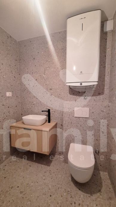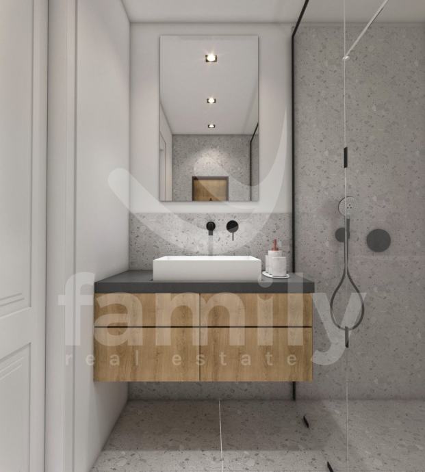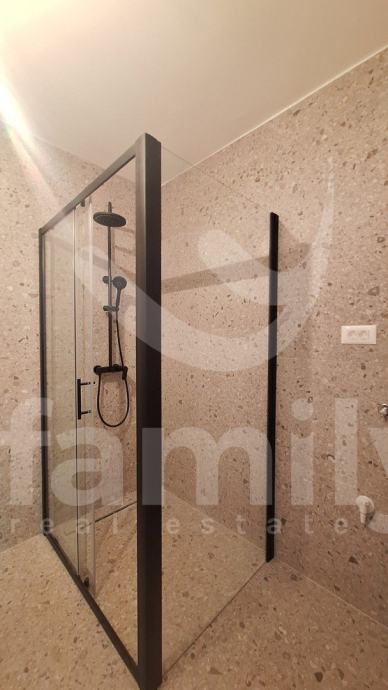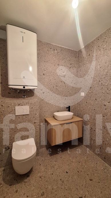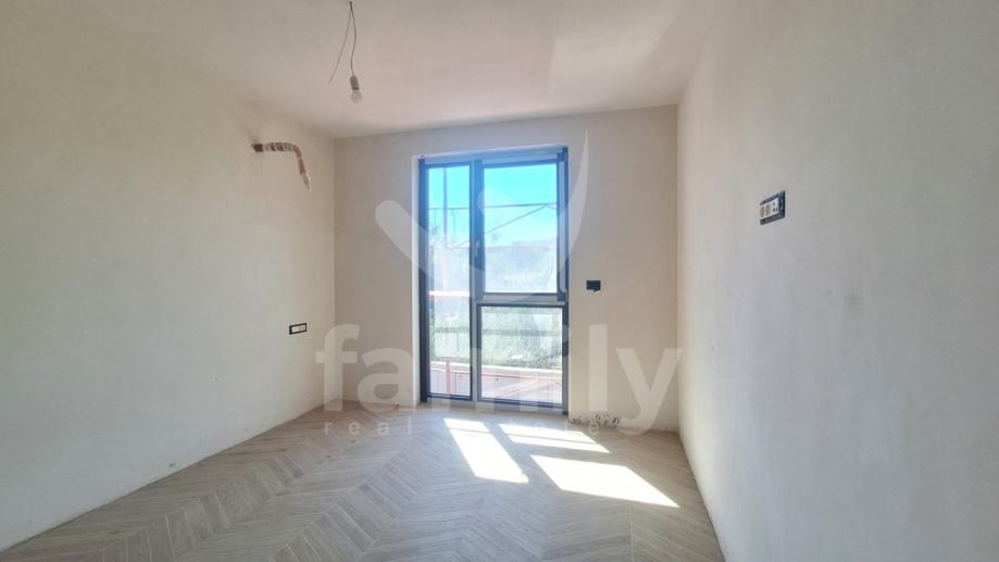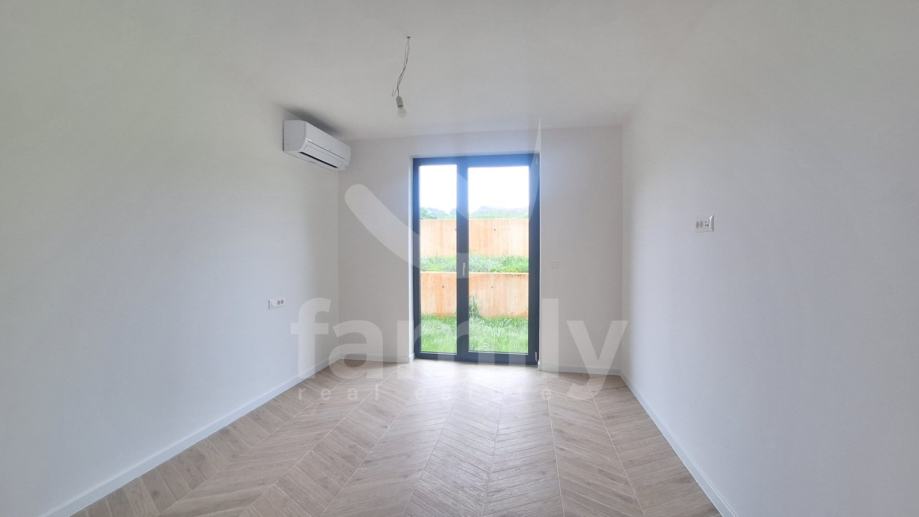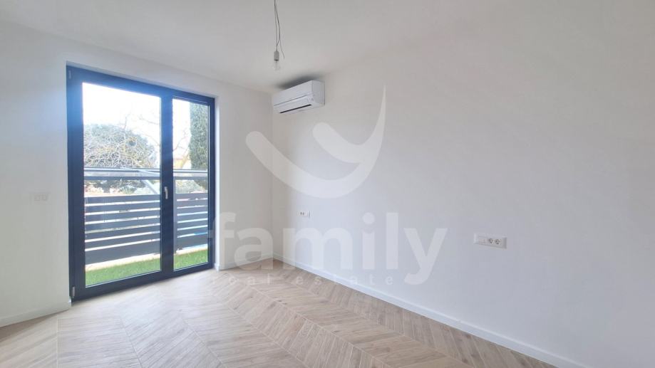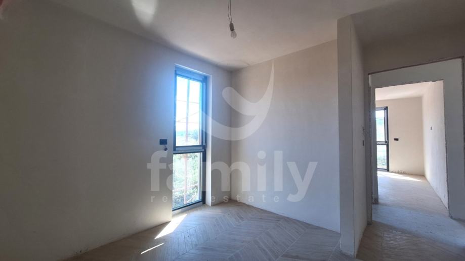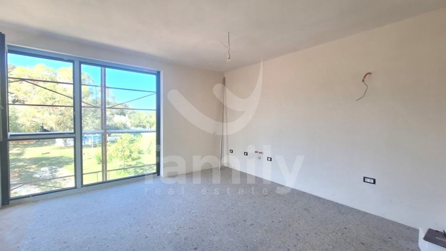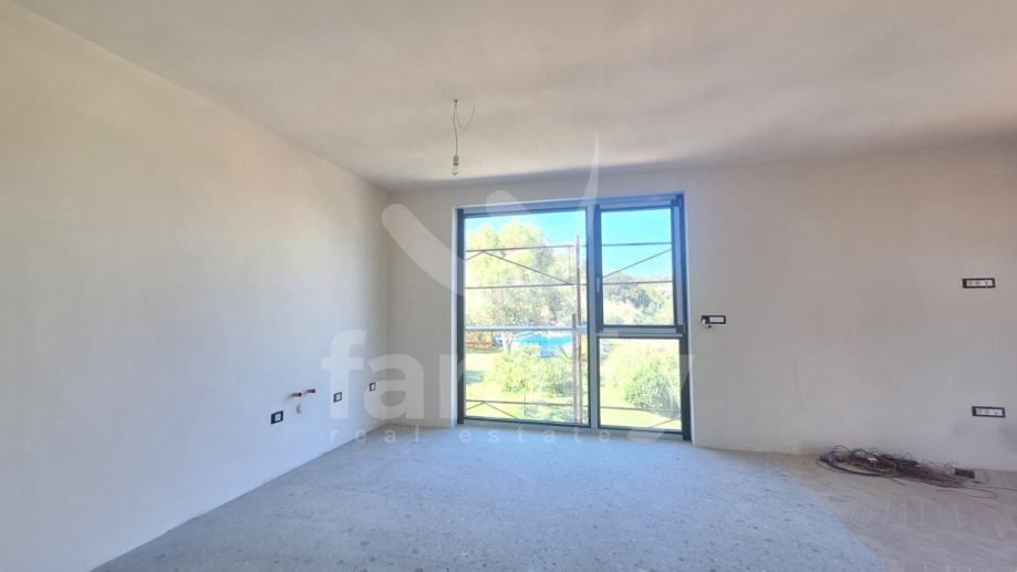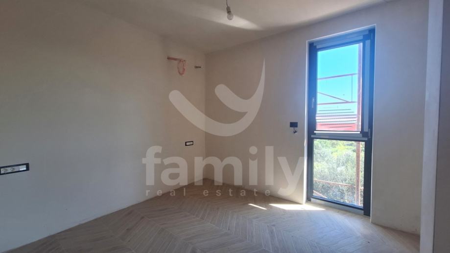 Upravo u Banjolama na veoma mirnoj lokaciji se nalazi navedena moderna i kvalitetna novogradnja manje stambene zgrade sa strane provjerenog investitora sa ukupno 8 stambenih jedinica. Navedeni stan površine 62,34 m2 se nalazi na prvom katu te se isti sastoji od ulaznog predprostora opremljen protuprovalnim ulaznim vratima, dvije osvijetljene i prostrane spavaće sobe, prostranog dnevnog boravka spojenog sa kuhinjom open space koncepta i izlazom na lođu površine 4,15 m2 kao i jednog kupatila opremljenog ugradbenim vodokotlićem marke Geberit, walk-in tušem, sprovedenim instalacijama za perilicu rublja, bojlerom marke Ariston kao i sustavom ventilacije. Podovi su u cijelom stanu obloženi visokokvalitetnom keramikom te je u spavaćoj sobi postavljena keramika imitacije drveta Sherborne. Sustav grijanja i hlađenja reguliran je putem dvije jedinice Mitsubishi klima uređaja, jedne jedinice postavljene u spavaćoj sobi i jedne u dnevnom boravku te je također sprovedeno podno grijanje na struju u cijelom objektu sa zasebnim Wi-Fi termostatima u svakoj prostoriji. Postavljena je PVC stolarija troslojnog stakla antracit boje i aluminijskim roletama na elektropodizače te će također biti postavljena ALU ograda vrta antracit boje. Zgrada je na katu opremljena termofasadom debljine 12 cm što svakako doprinosi izvrsnoj toplinskoj i zvučnoj izolaciji. Stanu pripada jedno otkriveno parkirno mjesto kao i jedan zajednički toalet koji se nalazi na hodniku zgrade te će isti biti u suvlasništvu svih sustanara te je planirani završetak radova kraj 2025. godine.