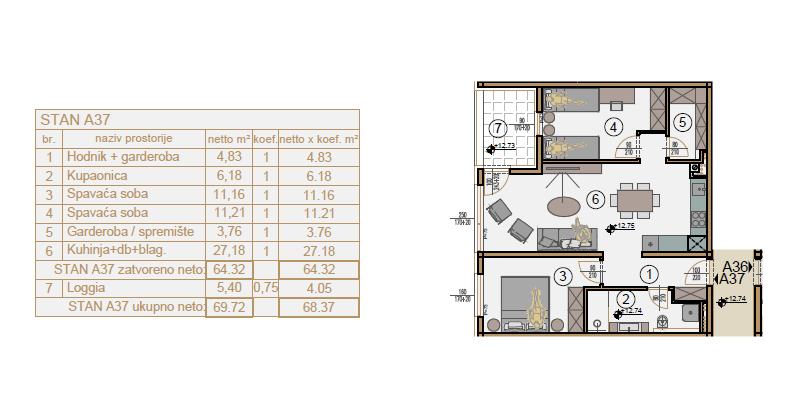 Stan ukupne površine 68,37 m² sastoji se od ulaznog hodnika s garderobnim prostorom, otvorenog koncepta kuhinje, dnevnog boravka i blagovaonice, dvije spavaće sobe, ostave te moderne kupaonice. Posebnu vrijednost daje loggia, idealna za boravak tijekom cijele godine. Stanu pripadaju i dva garažna mjesta smještena u podzemnoj etaži zgrade.