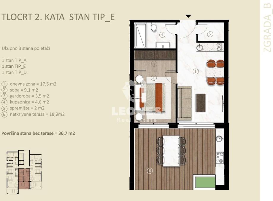 Stanu pripada i jedno natkriveno parkirno mjesto od 12,50 m2 kao i spremište u podrumu zgrade od 2,90 m2.