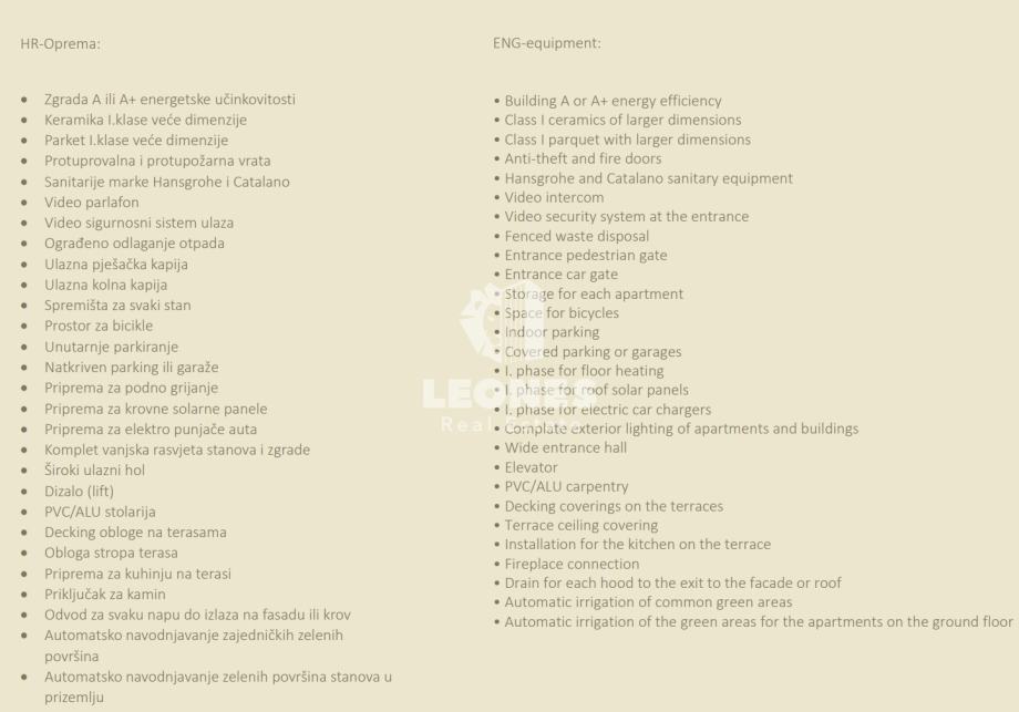 Garažna i parkirna mjesta imati će glavnu ulaznu rampu s elektromotorom na daljinsko upravljanje kao i pripremu za punjače za električna vozila, video nadzor i video parlafon.