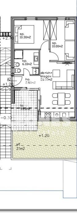 Neto površina stana iznosi 49,70m2 koja uključuje dvije spavaće sobe, kupaonicu te kuhinju s blagovaonicom kao i dnevni boravak iz kojeg se izlazi na lođu od 9m2 i vrt od 23m2.