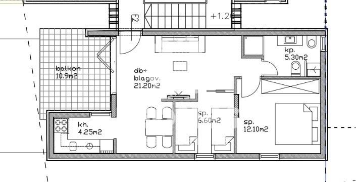 Ima 49,56m2 neto korisne površine + 10,90m2 natkrivene terase dok ostala kvadratura pripada spremištu (11m2) te stanu pripadaju dva parkirna mjesta od kojih je jedno natkriveno a jedno nenatkriveno.