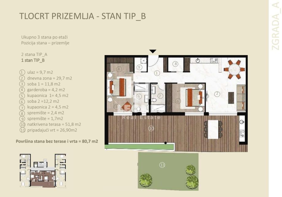 Stanu pripada i natkrivena terasa od 51,80m2, vrt od 26,80m2, jedno natkriveno parkirno mjesto od 12,50 m2 kao i spremište u suterenu zgrade od 5,10 m2.