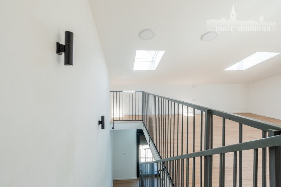 Na prvome katu se nalaze tri spavaće sobe, od kojih jedna ima balkon i dvije kupaone, dok se u potkrovlju nalazi studio apartman sa sobom u kojem su predviđene instalacije za malu kuhinju i kupanica sa tušem. Ovaj prostor u potkrovlju ima i veliku terasu od 14 m2.