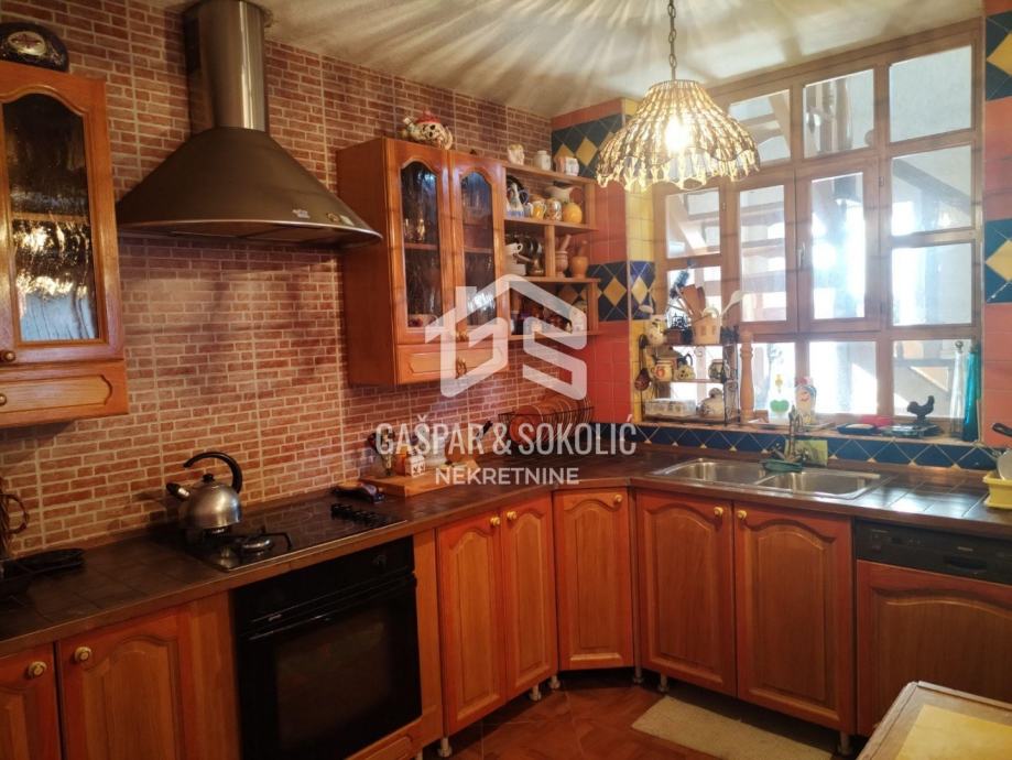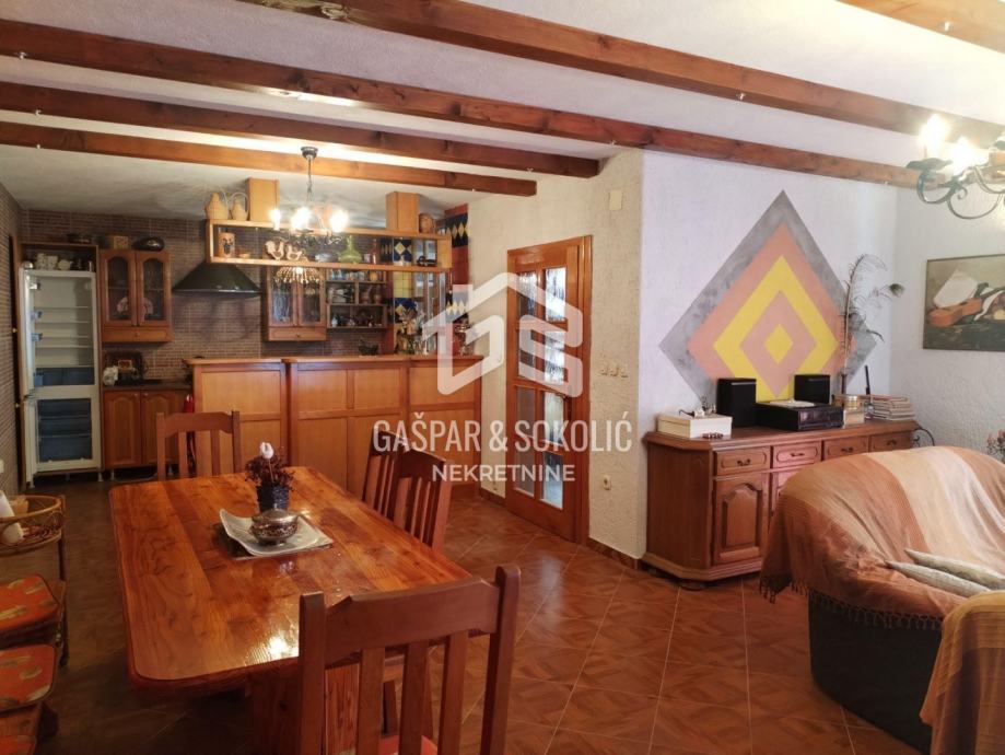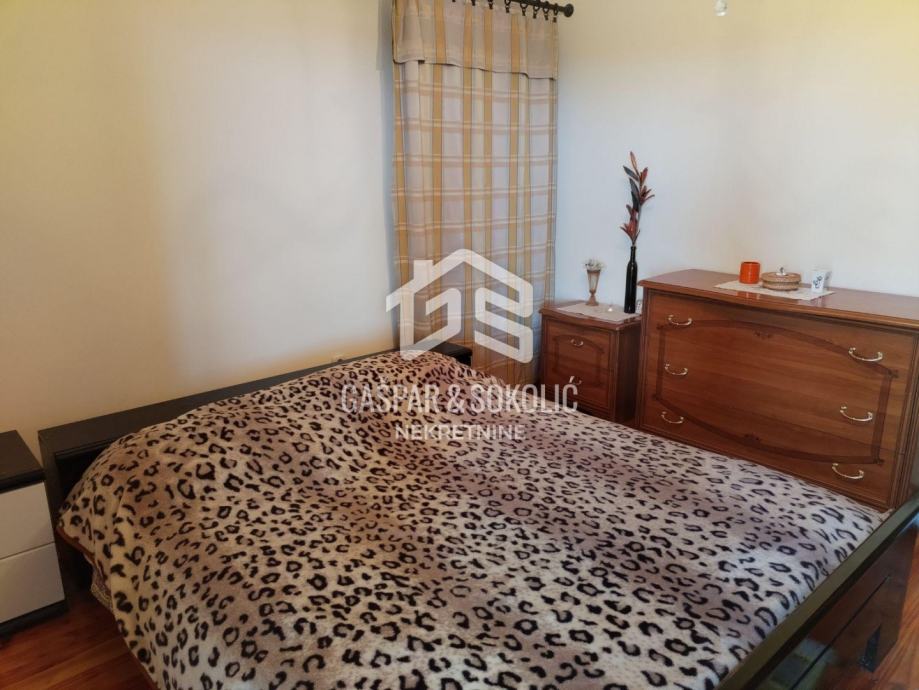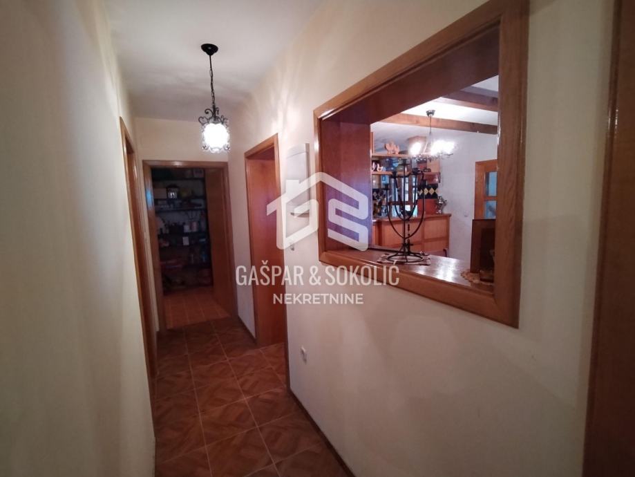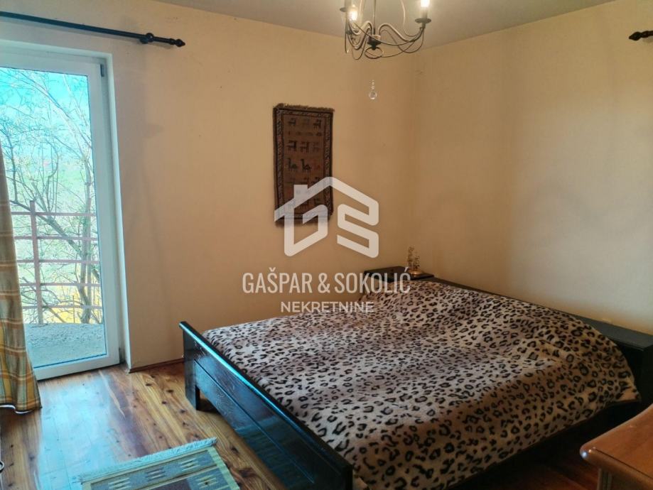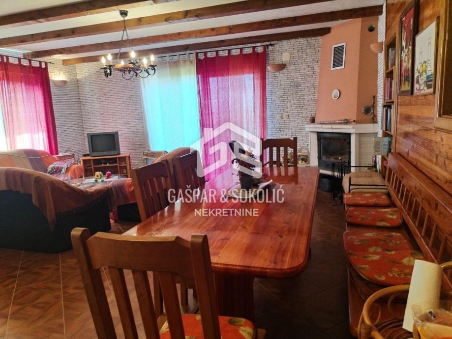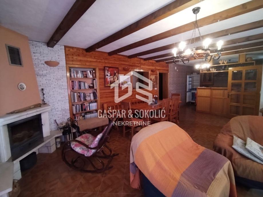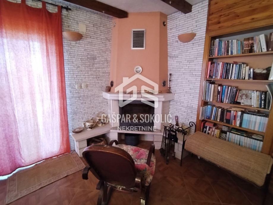 U uređenom stanu je kamin, na podu pločice i brodski pod (ariš), na zidovima kombinacija kamena, drva i pločica, grede u dnevnoj sobi, izlaz na terasu s lijepim pogledom.