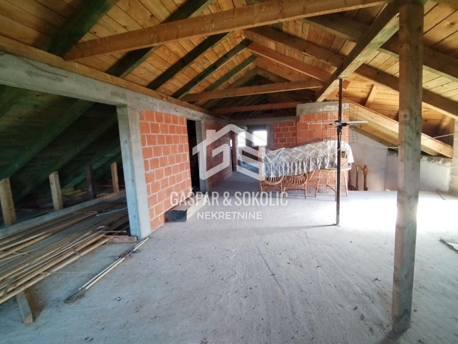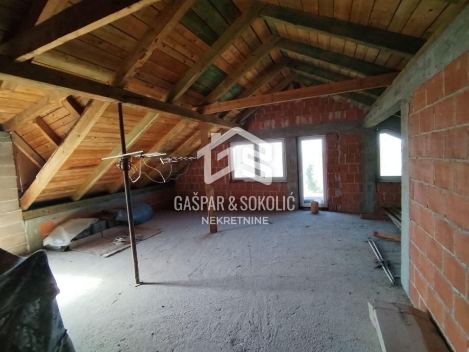 Potkrovlje je veliko, prostrano, s vise prozora i balkonskih vrata, što daje iznimnu osvjetljenost. Neto površina potkrovlja je 110,35m2. Krovište – glineni crijep.
