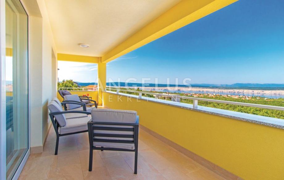Kuća ima dvije velike natkrivene terase od 20 m2, te jednu manju, sa prekrasnim pogledom na Kvarnerski zaljev i otok Krk, idealne za opuštanje, uživanje u jutarnjoj kavi ili večernjem druženju s obitelji i prijateljima. Ljepota okolnog krajolika, pogled na more s terasa dodatno naglašava jedinstvenost ove nekretnine. Svaka etaža ima lijep stambeni prostor površine 119 m2 koji se sastoji od kuhinje s dnevnim boravkom, velike spavaće sobe s kupaonicom, spavaće sobe i zasebne kupaonice (tuš/WC).