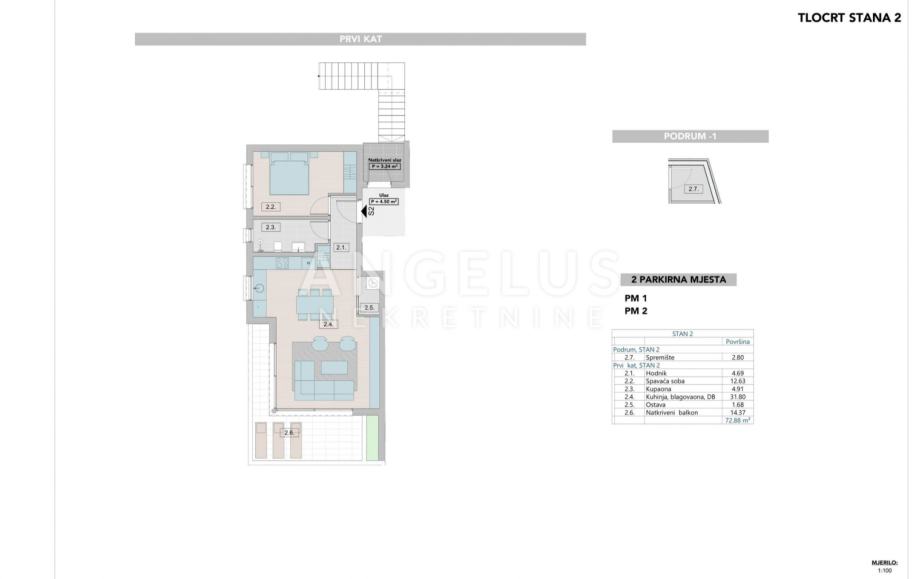 OPIS: Na mirnoj lokaciji, na 1.katu ove moderne urbane vile, nalazi se luksuzni stan površine 72,88 m2 stambene površine, koji sastoji se od dnevnog boravka s kuhinjom i blagovaonom, hodnika, spavaće sobe, kupaonice, ostave i prostranog balkona od 20 m2. Stanu pripada i podrumski prostor - ostava od 4 m2.