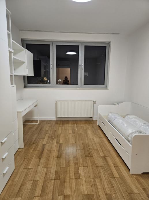 Sastoji se od ulaznog hodnika s ugrađenim ormarom, toaleta, prostranog boravka s kuhinjom i blagovaonicom, dvije spavaće sobe, garderobe, kupaonice, toaleta, i loggie.