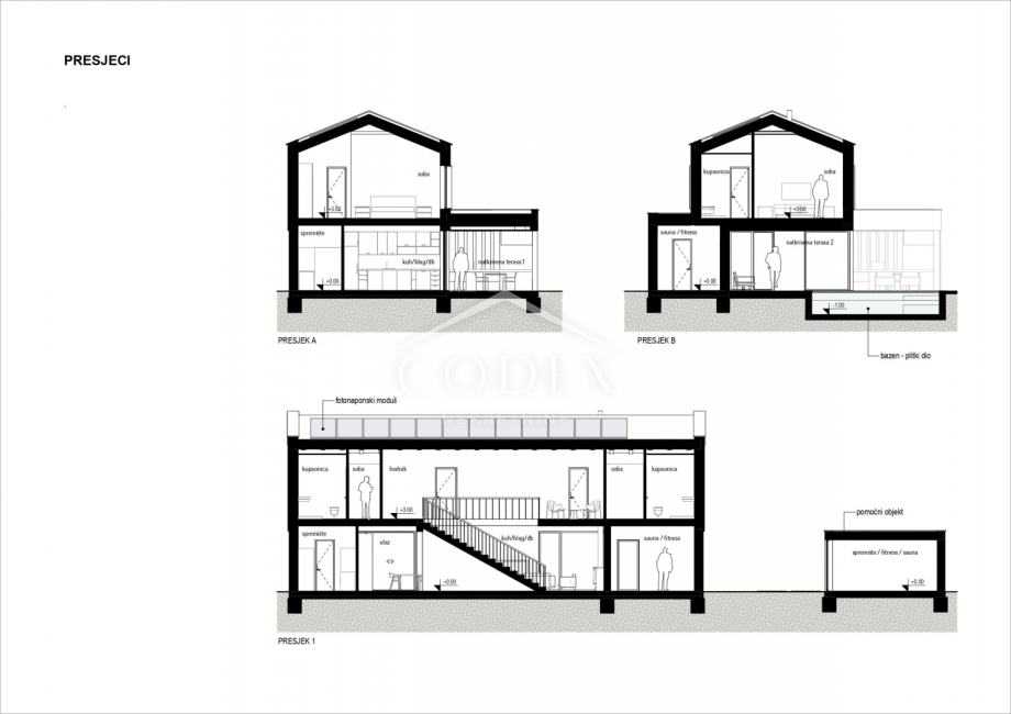Na prizemlju se također nalaze dodatne prostorije koje dodatno podižu kvalitetu života. Spremište je praktično za odlaganje stvari, dok prostorija za saunu i fitness osigurava mogućnost opuštanja i održavanja tjelesne aktivnosti bez napuštanja doma. Iz dnevnog dijela izlazi se na natkrivenu terasu koja se prostire prema vanjskom prostoru. Ovdje se nalazi ljetna kuhinja, idealna za pripremu obroka na otvorenom, dok grijani bazen s masažnim dijelom poziva na uživanje kroz cijelu godinu. Površina bazena je impresivnih 48 m2, savršena za obiteljska kupanja ili opuštajuće trenutke s prijateljima.