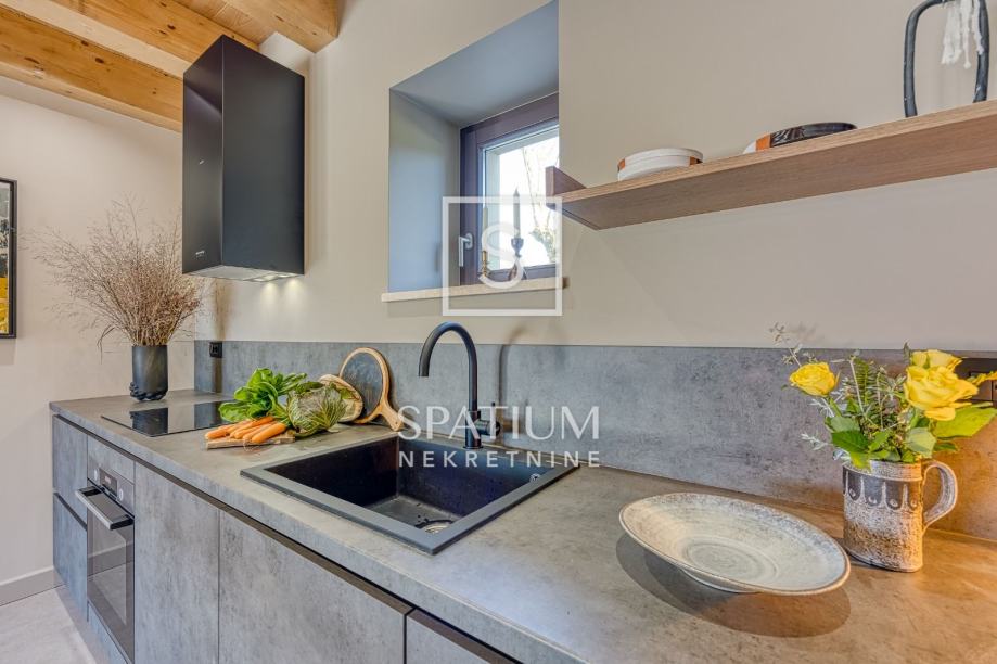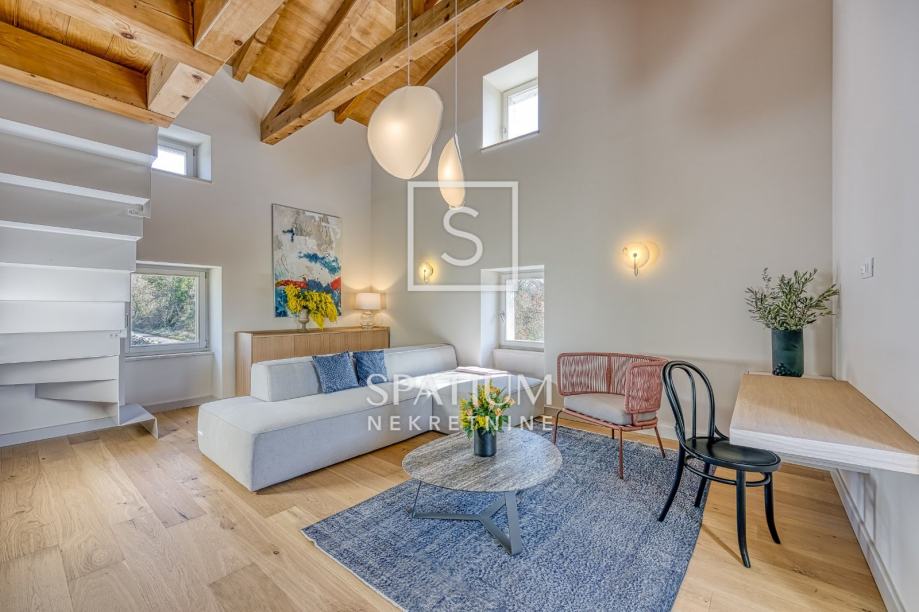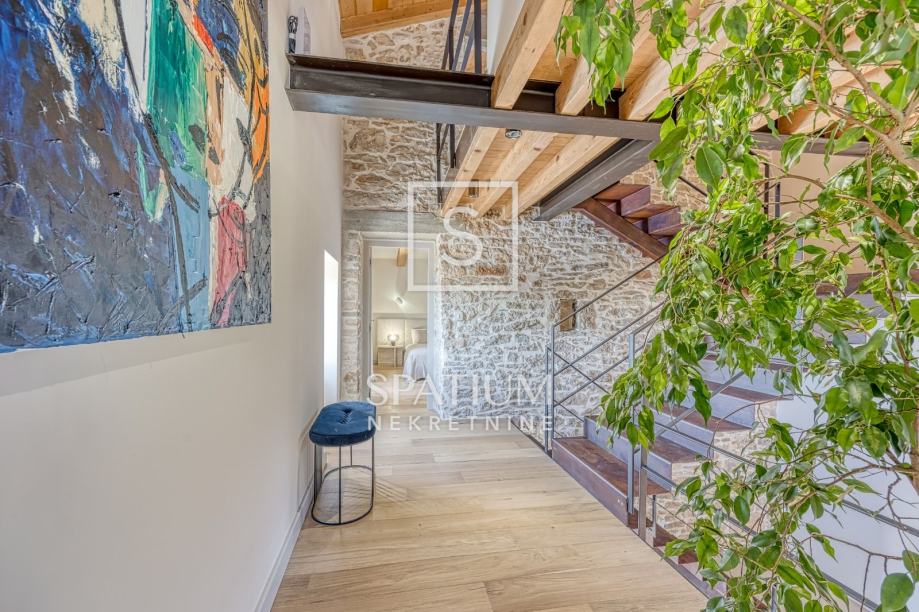 Na prvom katu, s lijeve strane, smještena je dodatna dnevna soba s visokim stropom, moderna kupaonica te galerija na kojoj se nalazi spavaća soba, do koje vode metalne stepenice.