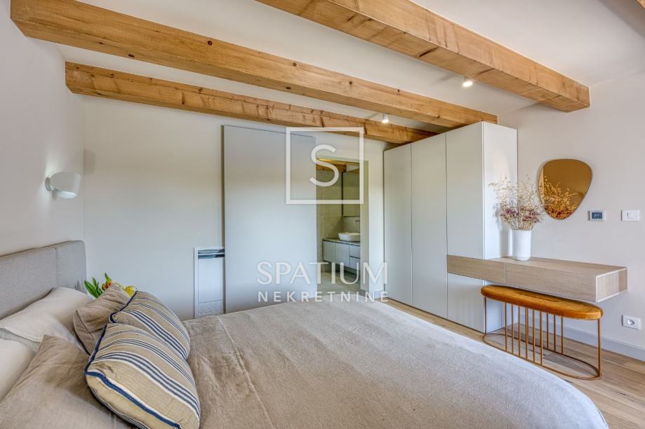 Metalnim stubištem uspinjemo se do potkrovlja, gdje je uređena još jedna spavaća soba i pripadajuća kupaonica.