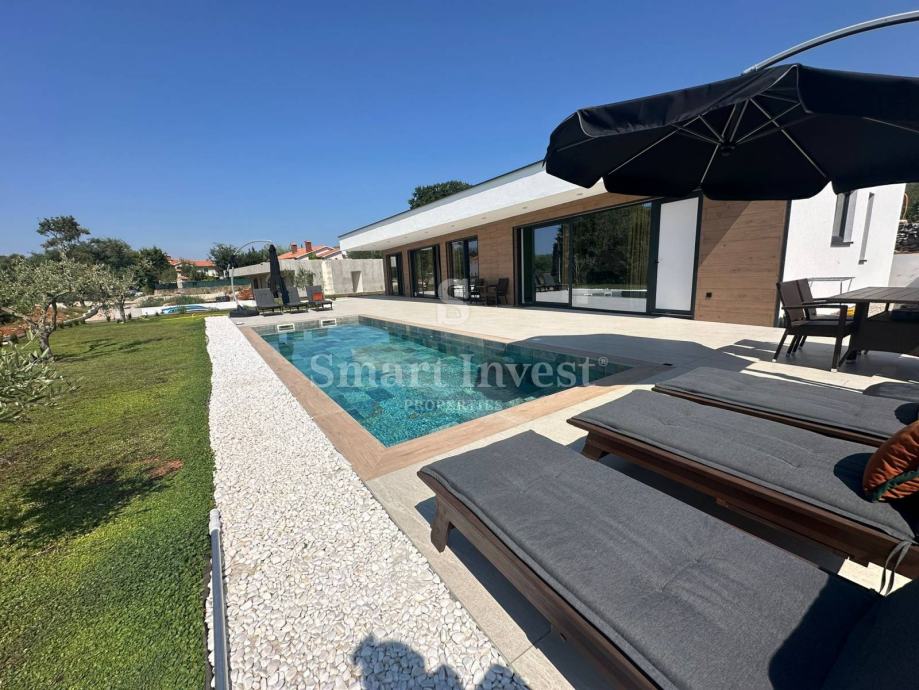 Nova moderna prizemnica (208m2) sa bazenom, dva stana i lijepim mediteranskim vrtom (veličine 800m2) smjestila se nedaleko Labina i Rapca, na istočnoj obali Istre. Sastoji se od dva odvojena stana s izlazom u vrt sa zajedničkim bazenom sa sunčalištem.