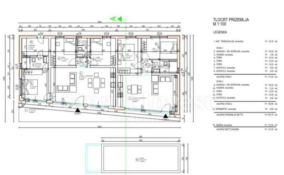 STAN 2 - sastoji se od open space kuhinje, blagovaone i dnevnog boravka, 3 sobe, 2 kupaonice i tehničke sobe.
