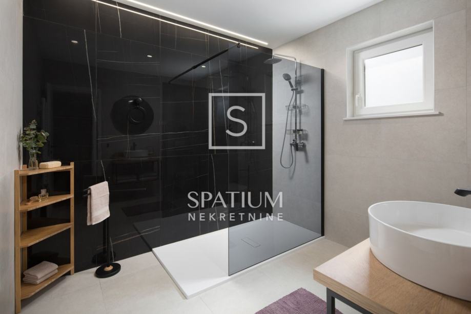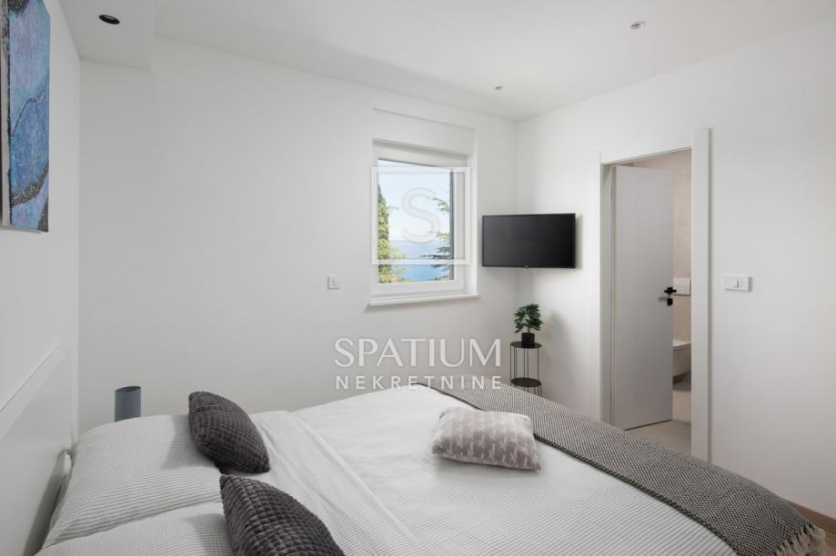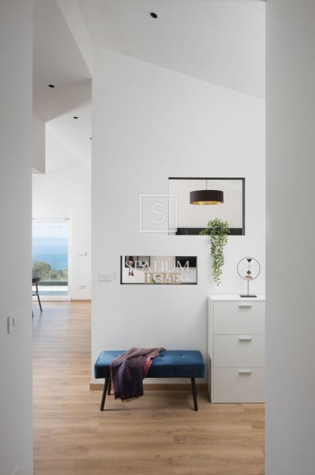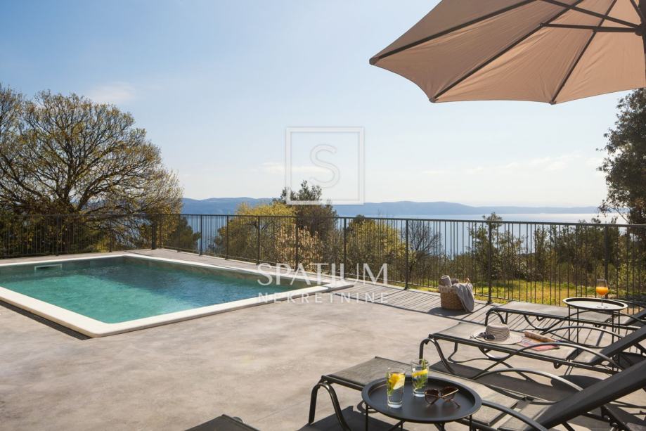 LABIN, u ponudi je prekrasna kuća s panoramskim pogledom na more i otok Cres, površine 173 m², smještena na uređenoj parceli od 505 m². Kuća se sastoji od prizemlja i suterena, s dvije prostrane spavaće sobe, obje s vlastitim kupaonicama, a jedna dodatno opremljena walk-in ormarom. Otvoreni dnevni prostor objedinjuje kuhinju, blagovaonicu i dnevni boravak, s izlazom na veliku terasu s koje se pruža otvoren i neometan pogled na more. U sklopu kuće nalazi se i gostinjski toalet. U suterenu je konoba s tradicionalnim ognjištem i vlastitim toaletom — idealan prostor za druženja. Okućnica je uređena, s bazenom 7 x 3,5 m i automatskim navodnjavanjem. Kuća je potpuno opremljena, s četiri klima uređaja, pripremom za podno grijanje u cijeloj kuće, električnim roletama, PVC stolarijom s troslojnim staklima i komarnicima. Na raspolaganju su četiri parkirna mjesta, a nekretnina je opremljena i videonadzorom. Vlasništvo uredno.