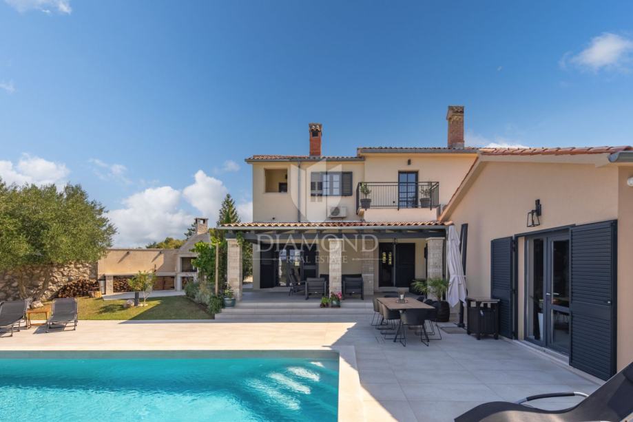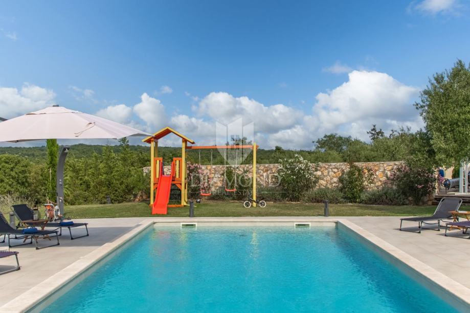 Okućnica se prostire na prostranih 2459 m2 i nudi obilje prostora za opuštanje na otvorenom, druženje s prijateljima i obitelji te uživanje u prekrasnom krajoliku. Parkić za djecu gdje se mogu zabavljati na ljuljačkama, toboganu ili trampolinu. U nastavku natkrivene terase koja omogućava ugodan odmor u hladovini tijekom cijelog dana i pogled na prekrasno uređenu okućnicu i bazen, nalazi se i vanjska ljetna kuhinja za praktična i funkcionalna druženja na otvorenom.
