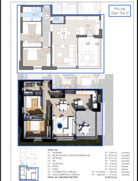 Predmet prodaje je elegantan stan na prvom katu zgrade. Sastoji se od ulaznog hodnika, dvije udobne spavaće sobe, kupaonice, gostinjskog toaleta, hodnika i prostranog otvorenog prostora koji spaja dnevni boravak, blagovaonicu i kuhinju s izlazom na natkrivenu terasu – idealno za opuštanje i obiteljske trenutke.