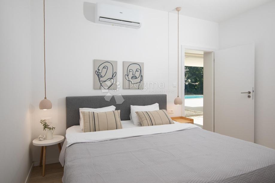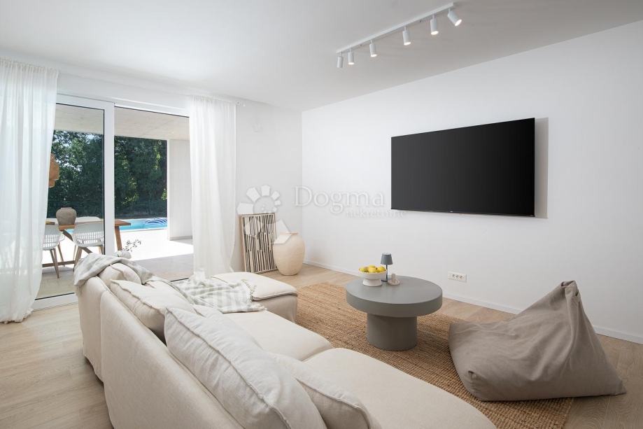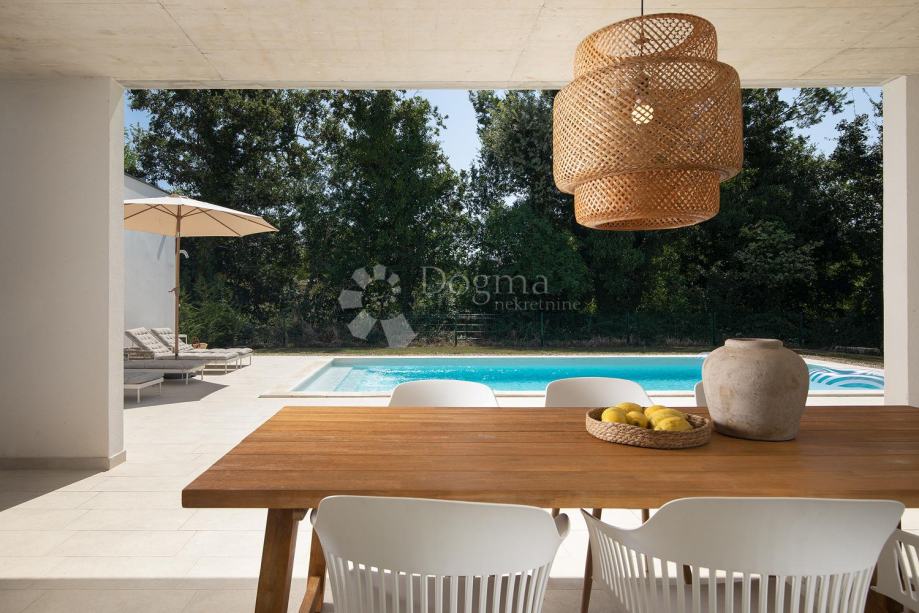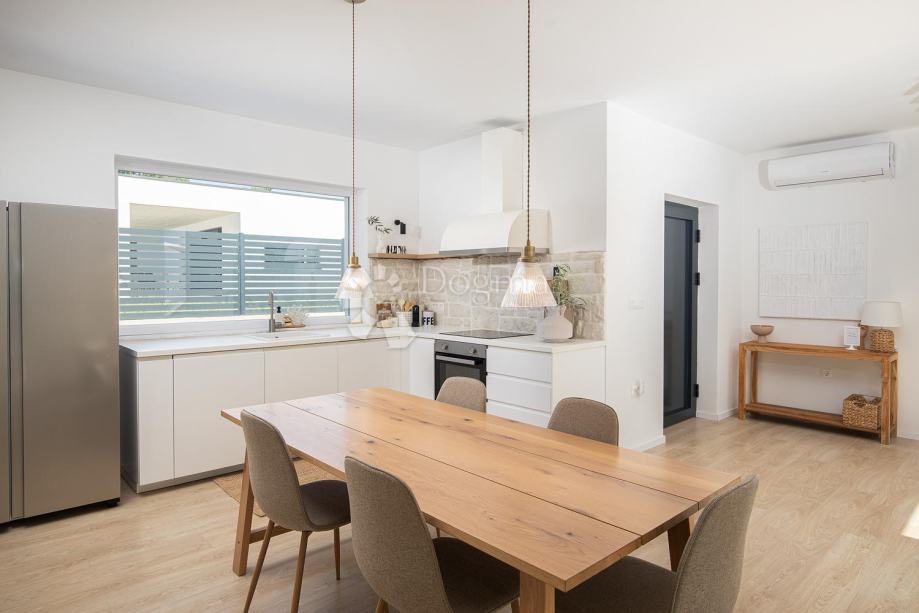 Kuća se satoji od open spacea -kuhinje, dnevnog boravka i blagavaone sa staklenim stjenama kroz koje se izlazi na na bazeni i ljetnu kuhinju .