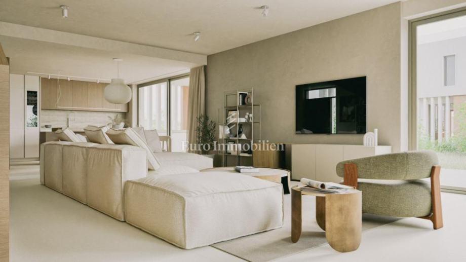 Prizemlje je moderno uređeno s open space konceptom kuhinje, blagovaone i dnevnog boravka, čineći prostor funkcionalnim i prozračnim.