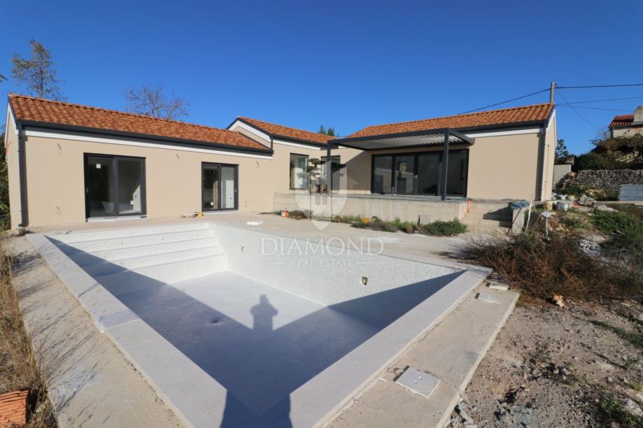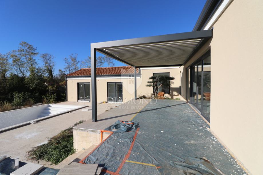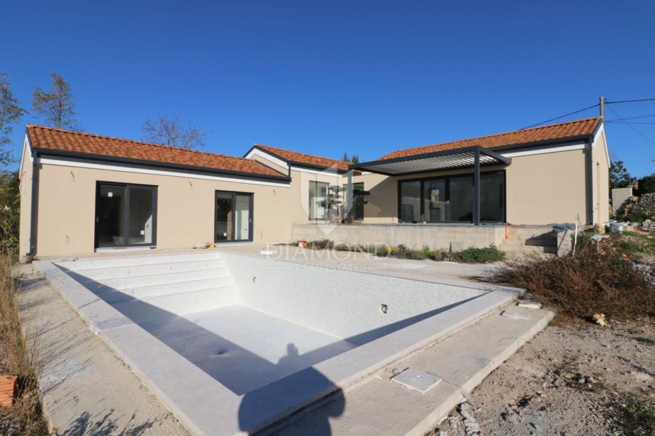 Moderna prizemnica ukupne je kvadrature 182 m2 a sastoji se od open space dnevnog prostora koji obuhvaća kuhinju, blagovaonicu i dnevni boravak, gostinjski toalet, spremište te tri spavaće sobe sa vlastitim kupaonicama. U sklopu kuće nalazi se i garaža veličine 19 m2 te strojarnica za bazensku tehniku. Odličan raspored nekretnine odvaja dnevni od noćnog dijela te osigurava jednu lijepo povezanu cjelinu - svaka spavaća soba ima izlaz direktno na plažu bazena a dnevni prostor povezan je velikim staklenim stijenama sa vanjskom natkrivenom terasom gdje je predviđen prostor za blagovanje sa pogledom na bazen i uređenu okućnicu. Po pitanju tehnike i sustava grijanja i hlađenja planirana je ugradnja suvremenih sustava - klimatizirane prostorije putem dizalice topline, a biti će napravljena i priprema za fotonaponsku elektranu te solarni paneli za toplu vodu. U dnevnom prostoru predviđen je i ugradbeni kamin za dodatni ugođaj tijekom zimskih mjeseci.
