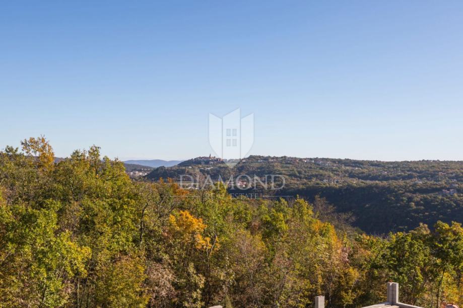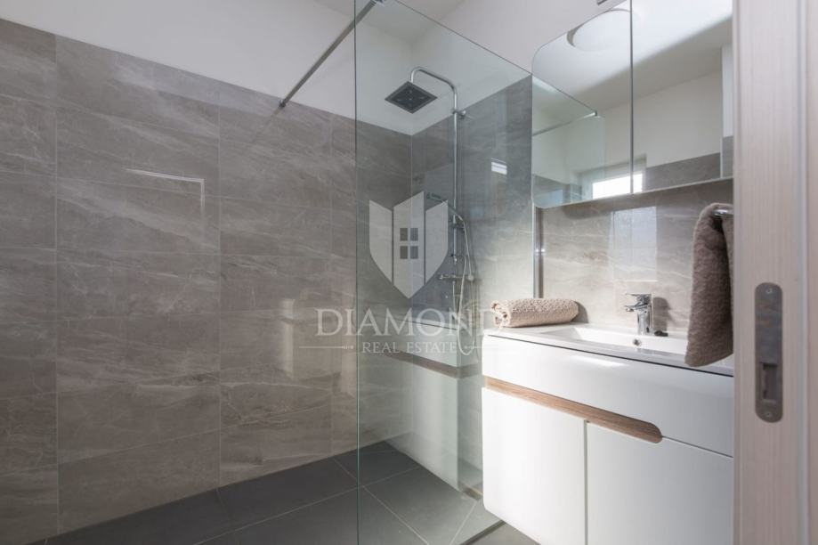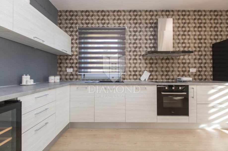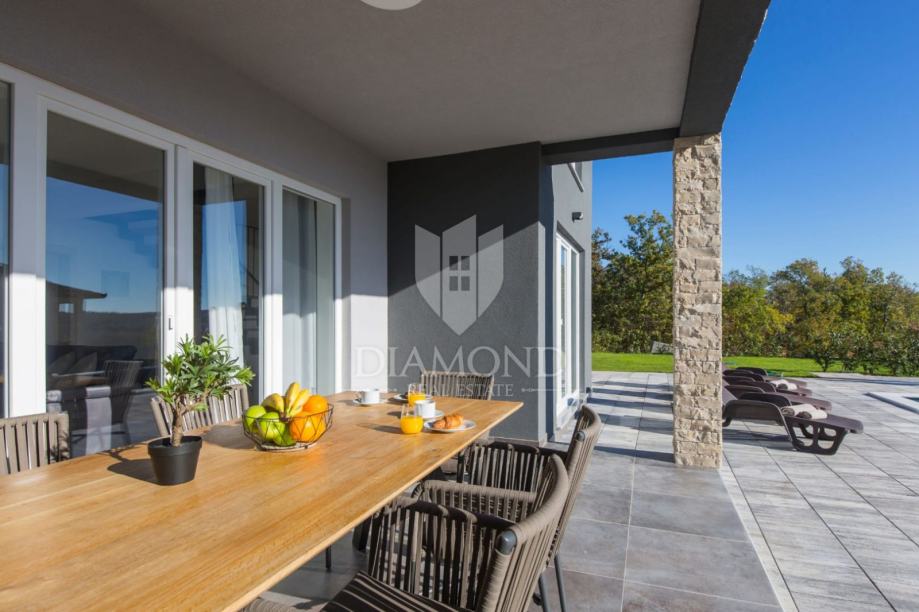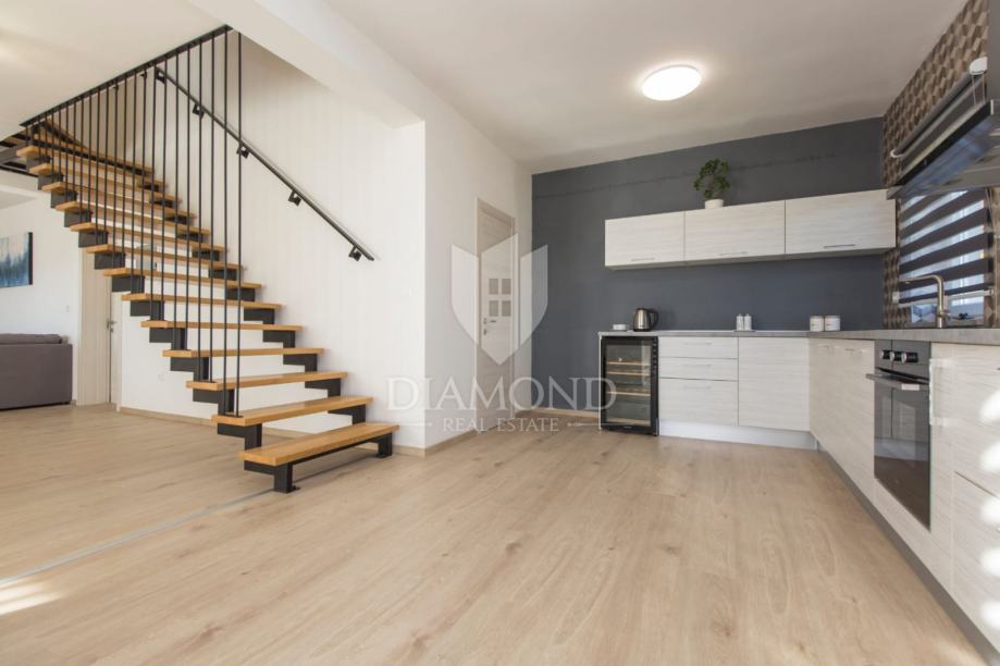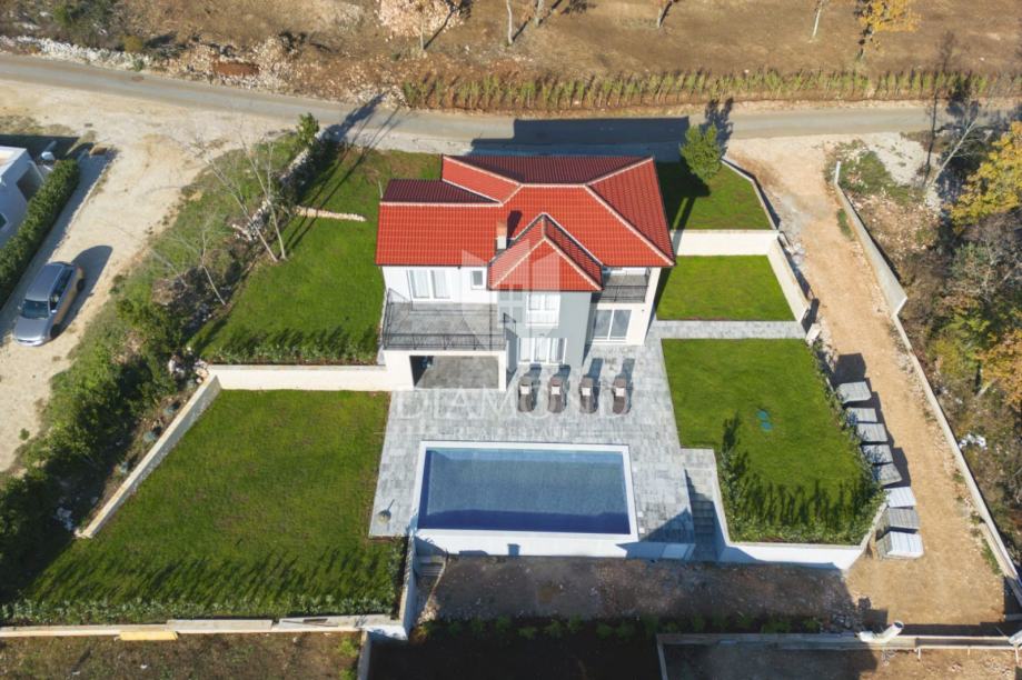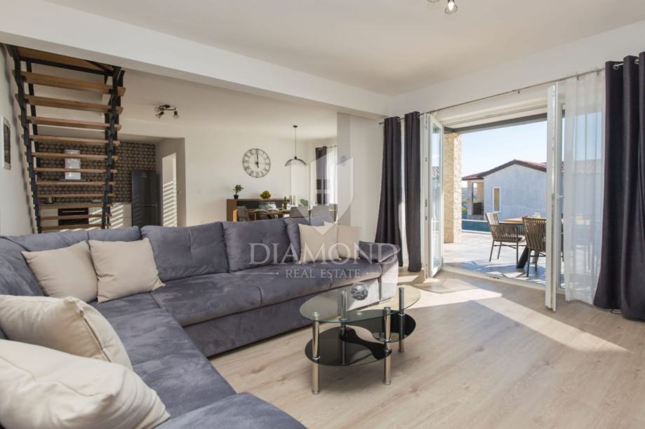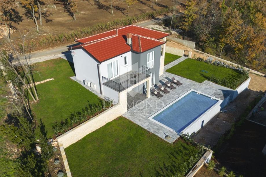 Smještena na lijepoj poziciji na uzvišenom terenu sa prekrasnim pogledom, kuća za odmor s bazenom ukupne je kvadrature 165 m2. Koncipirana je kao katnica. Prizemlje obuhvaća prostrani dnevni boravak uz open space koncept sa blagovaonicom i kuhinjom sa ostavom. Tu se nalazi i gostinjski toalet te praonica. Na katu se nalaze tri komforne spavaće sobe sa vlastitim kupaonicama, a dvije imaju i izlaz na balkon sa kojega se pruža prekrasni otvoreni pogled na brežuljkasti krajolik i na Stari grad Labin.