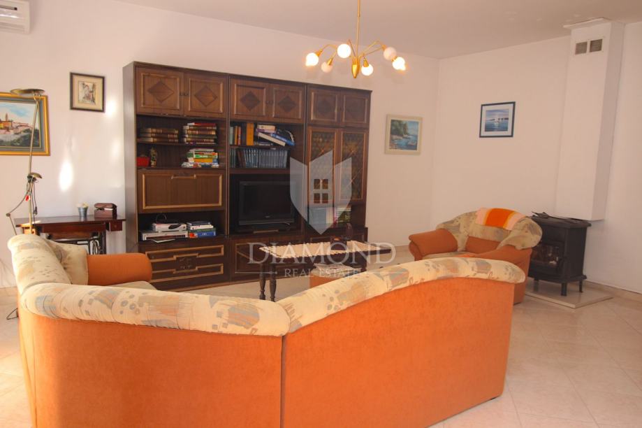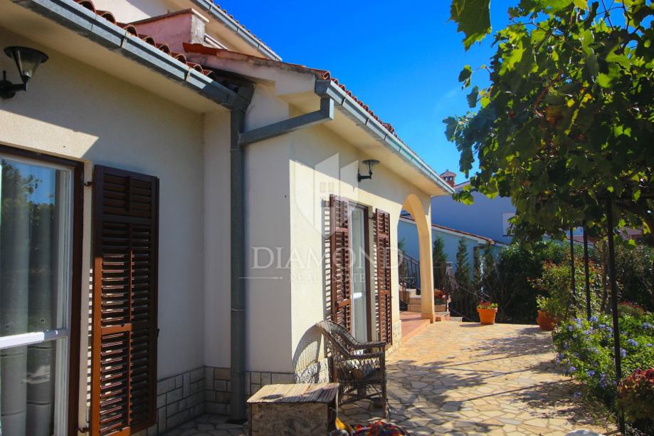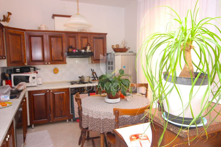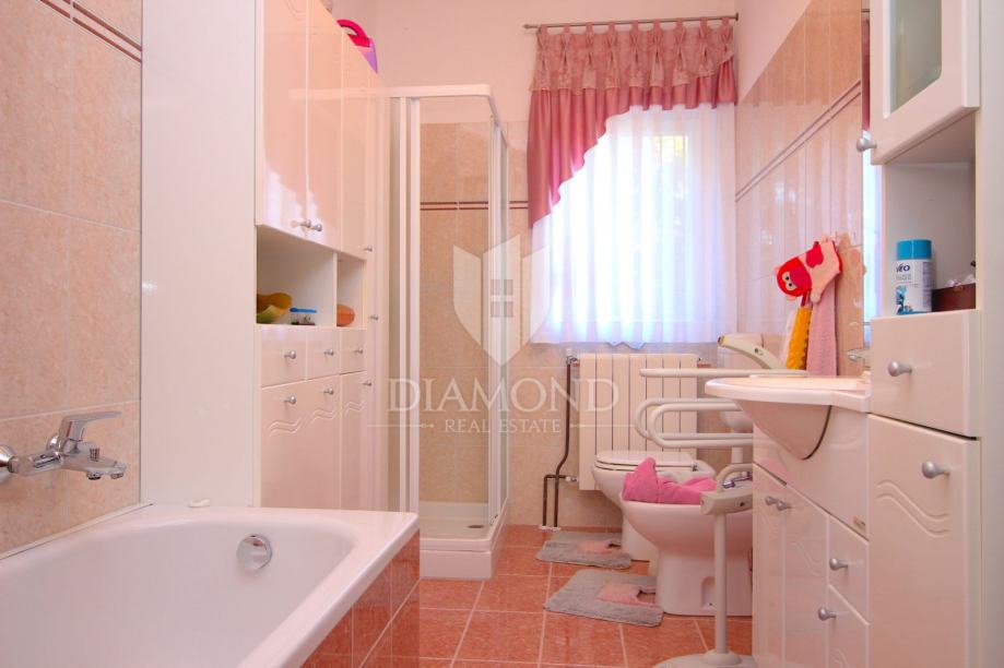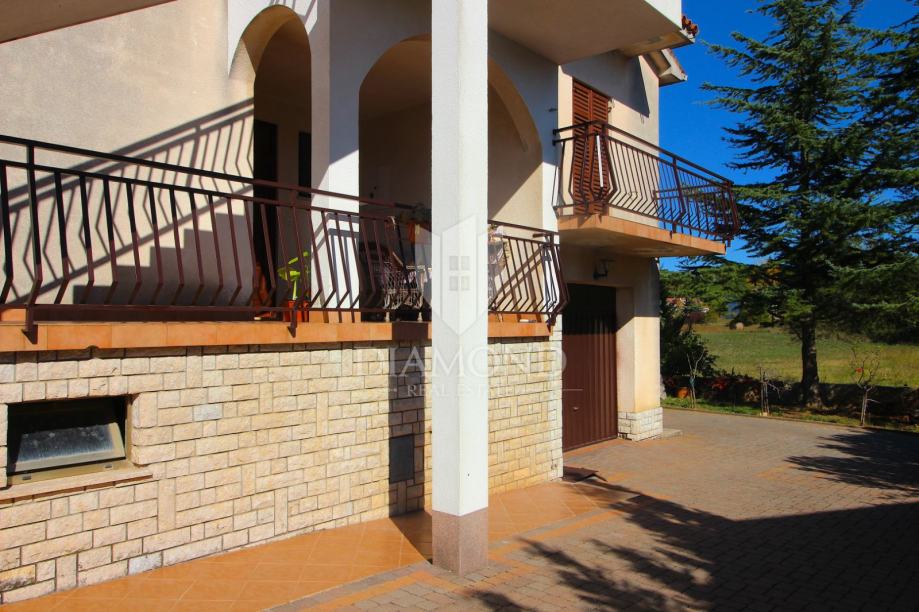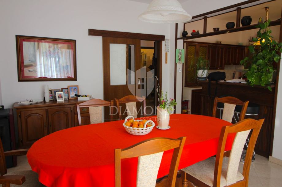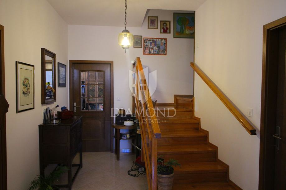 Nedaleko centra grada nalazi se ova lijepa obiteljska kuća. Proteže se kroz suteren, prizemlje i kat. U suterenu se nalazi konoba, kuhinja i velika garaža. Prizemlje čini veći stan sa kuhinjom, blagovaonom, dnevnim boravkom i kupaonom, te nas par stepenica dijeli od prostora gdje su smještene tri spavaće sobe i kupaona. Na katu se nalazi