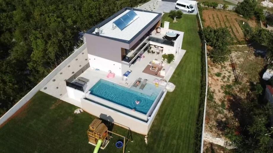 Kuća ima podno grijanje i hlađenje preko toplinske pumpe te solarne panele.