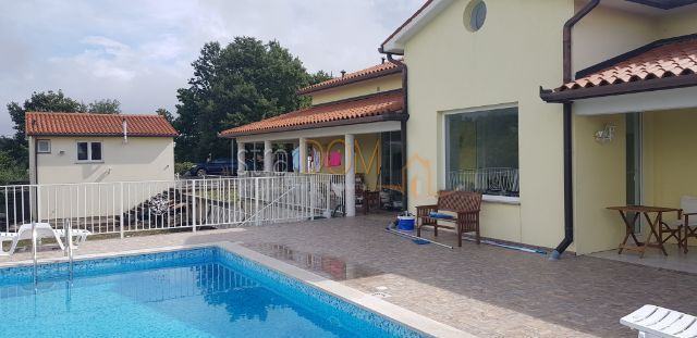 Komforna obiteljska kuća sa bazenom i prekrasnom velikom okućnicom. Smještena je u nadaleko jezgre starog grada Labina koje pripada istočnoj obali Istre. Rabac, najpoznatije turističko mjesto udaljeno je svega 4km, a za samo 10min autom stiže se do prekrasne lučice Prtlog (Duga Luka). Kuća je smještena na vrlo lijepoj i mirnoj lokaciji te se nakon uređenja može koristiti za stanovanje ali i u turističke svrhe. Sastoji se od suterena, prizemlja i potkrovlja. SUTEREN: garaža, kupaonica ukupne površine 44,50 m2 PRIZEMLJE: ulaz, hodnik, kuhinja i blagovaona, dnevni boravak sa izlazom na veliku terasu (57 m2), 3 sobe, 3 kupaonice, 2 spremišta, unutarnje stubište za potkrovlje. Ukupna površina prizemlja iznosi 239m2 POTKROVLJE: prostor bez pregradnih zidova (mogućnost uređenja još jedne stambene jedinice). Ukupna površina potkrovlja iznosi 186m2 Kuća je građena vrlo kvalitetno te je minimalno korištena i održavana. U dnevnom boravku nalazi se peć na drva dok su ostale prostorije opremljene klima uređajima. Na velikoj okućnici površine 1770m2 postavljen je bazen te ostavlja mogućnost postavljanja dodatnih sadržaja. Uz kuću se prodaje i cca. 500 m2 građevinskog zemljišta.