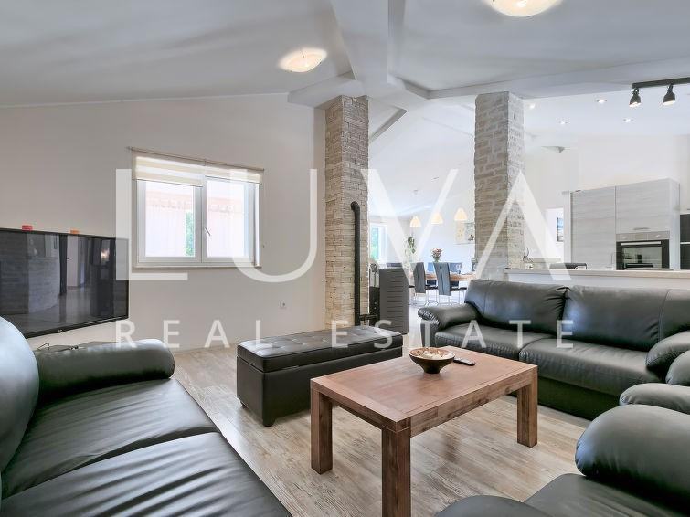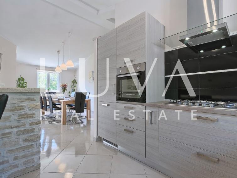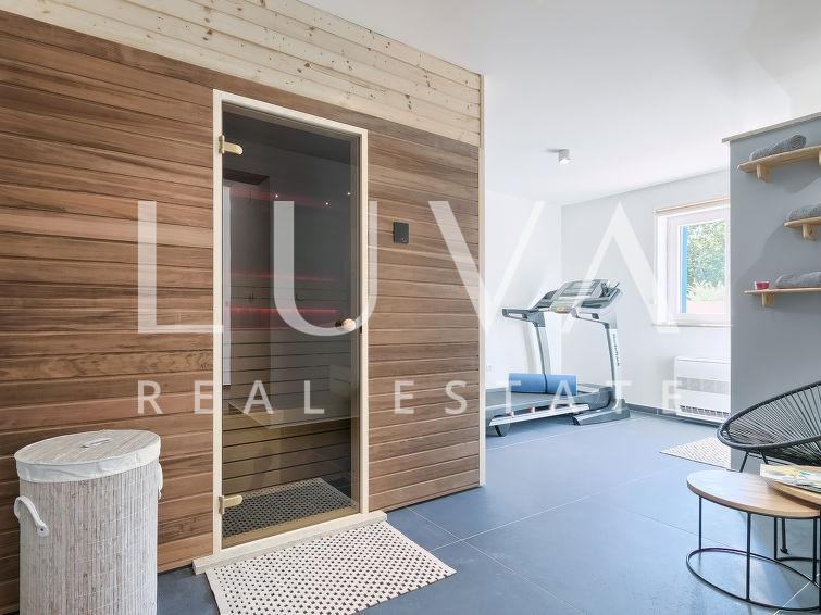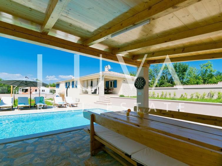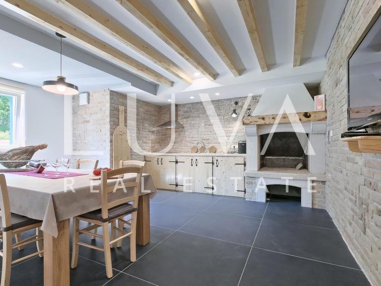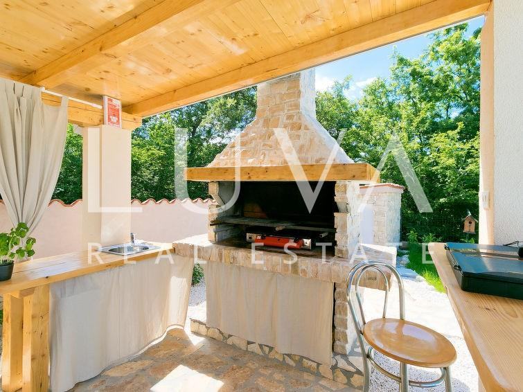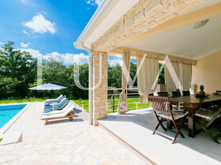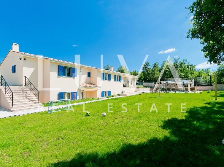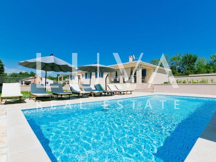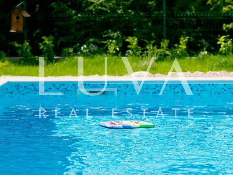 Prodaje se luksuzna kuća s bazenom u malom mjestu nedaleko od Labina. Kuća je površine 215 m2 na posjedu od 1470 m2. Prizemlje kuće sastoji se od prostranog ulaznog hodnika koji vodi do otvorenog dnevnog boravka i blagovaonice. Dnevni boravak je prozračan i osvijetljen, s velikim prozorima koji pružaju prekrasan pogled na vrt. Osim toga kuća ima 4 spavaće sobe s vlastitim kupaonicama i gostinjski WC. U suterenu kuće se nalazi prostorija sa saunom i spravama za vježbanje. Kuća je smještena na prilično velikom posjedu koji je lijepo uređen s mnogo zelenila, a osim vanjskog bazena kuća pruža i dječje igralište i lijepo uređenu vanjsku natkrivenu terasu s roštiljem.