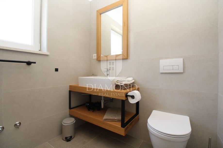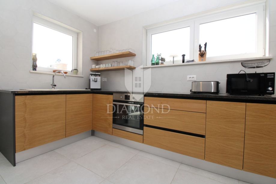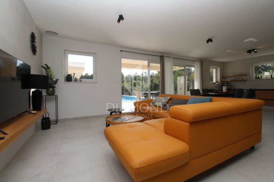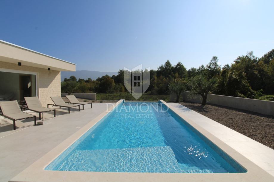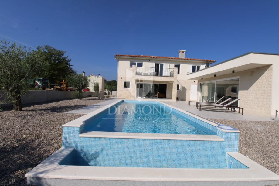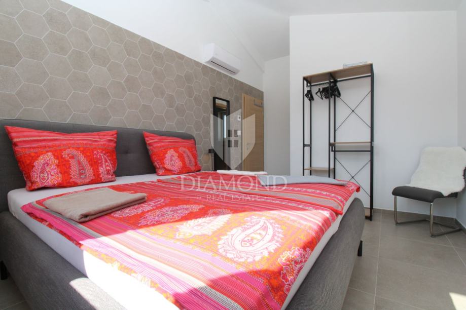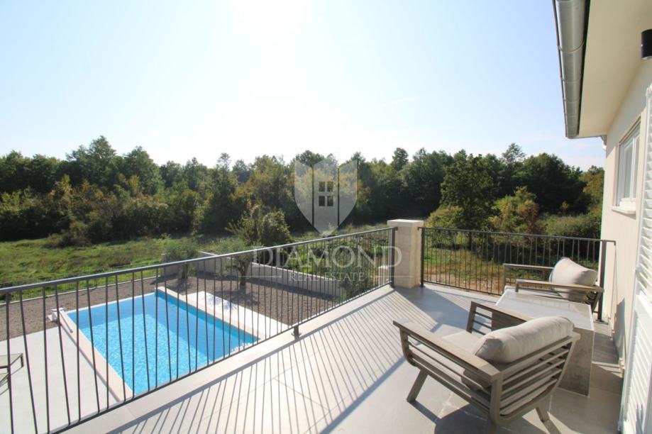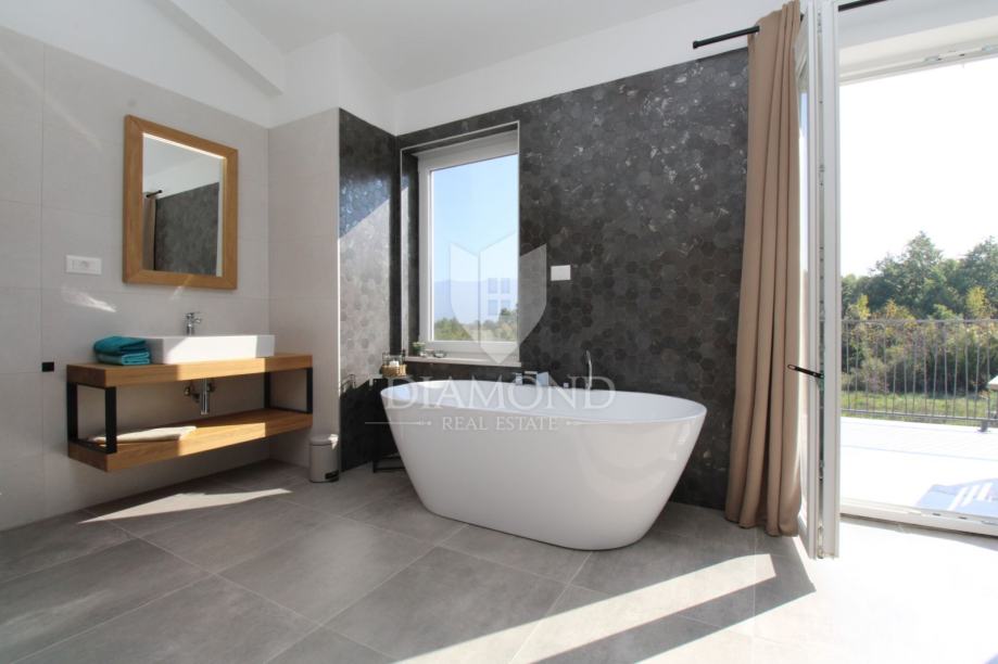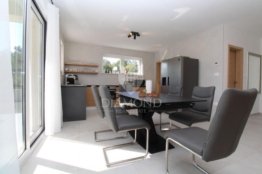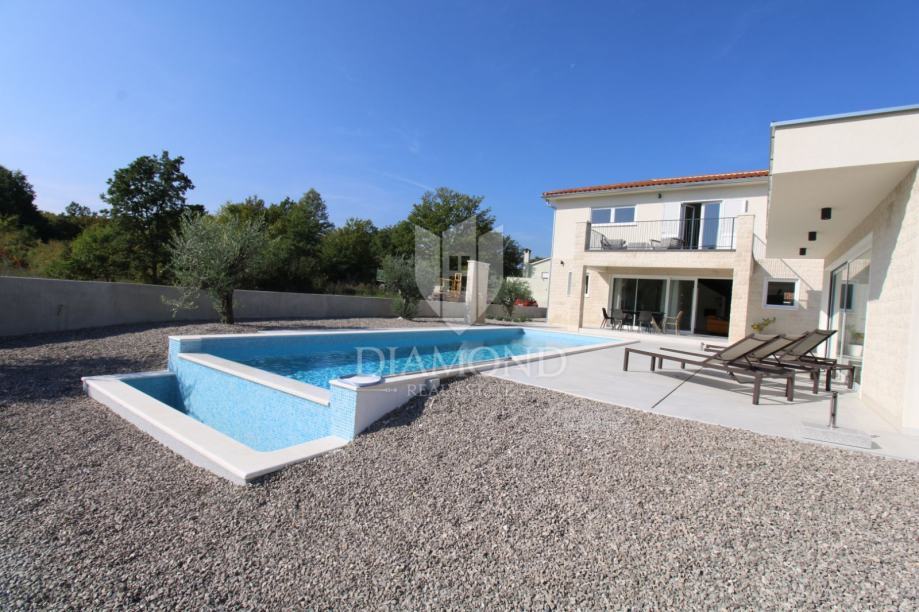 Na rubu manjeg naselja udaljenog od Labina 13 kilometara, prodajemo ovu novoizgrađenu kuću za odmor. Kuća je koncipirana kao katnica ukupne površine 180 m2. Kat predstavlja noćni dio sa tri spavaće sobe i tri kupaonice. Master spavaća soba ima i izlaz na balkon sa lijepim pogledom na bazen i okolno zelenilo. Prizemlje se sastoji od velikog, svijetlog prostora u koji je uklopljena potpuno opremljena kuhinja, blagovaonica i komforan dnevni boravak sa velikim staklenim stijenama kao poveznicama sa vanjskom terasom i plažom bazena. U prizemlju se nalazi i jedan gostinjski toalet te ostava. Interijer je modernog dizajna sa udobnim i funkcionalnim namještajem. U svakoj prostoriji postavljen je klima uređaj a kuća ima i podno grijanje. Postoji mogućnost i ugradnje peći u dnevni prostor.