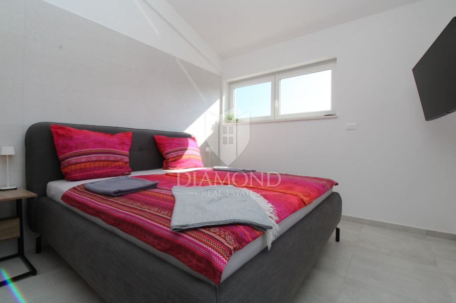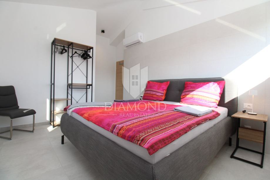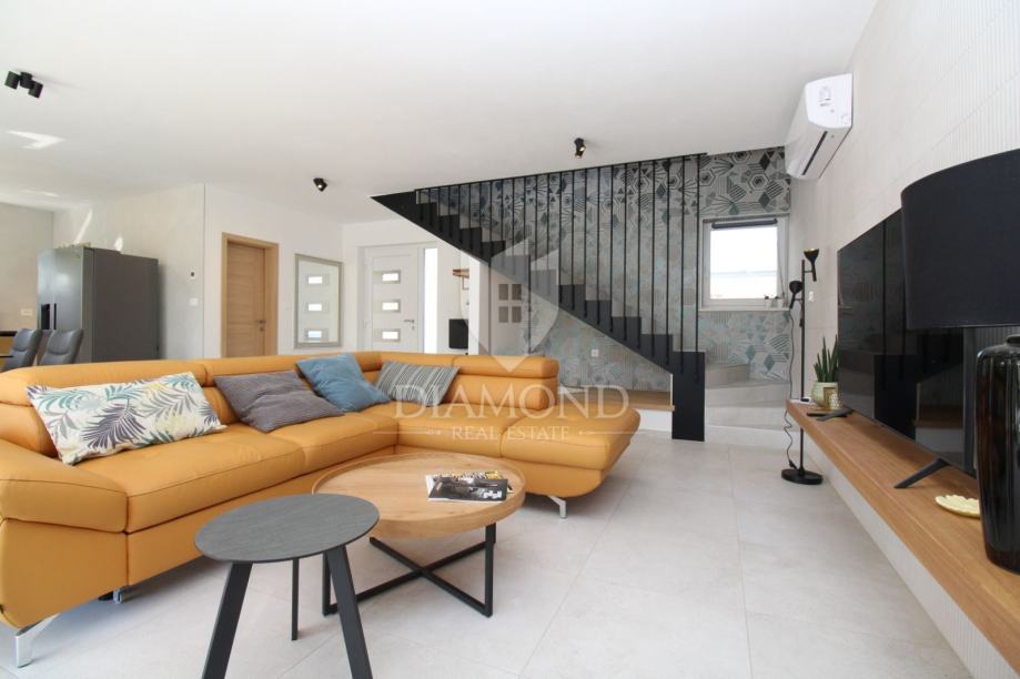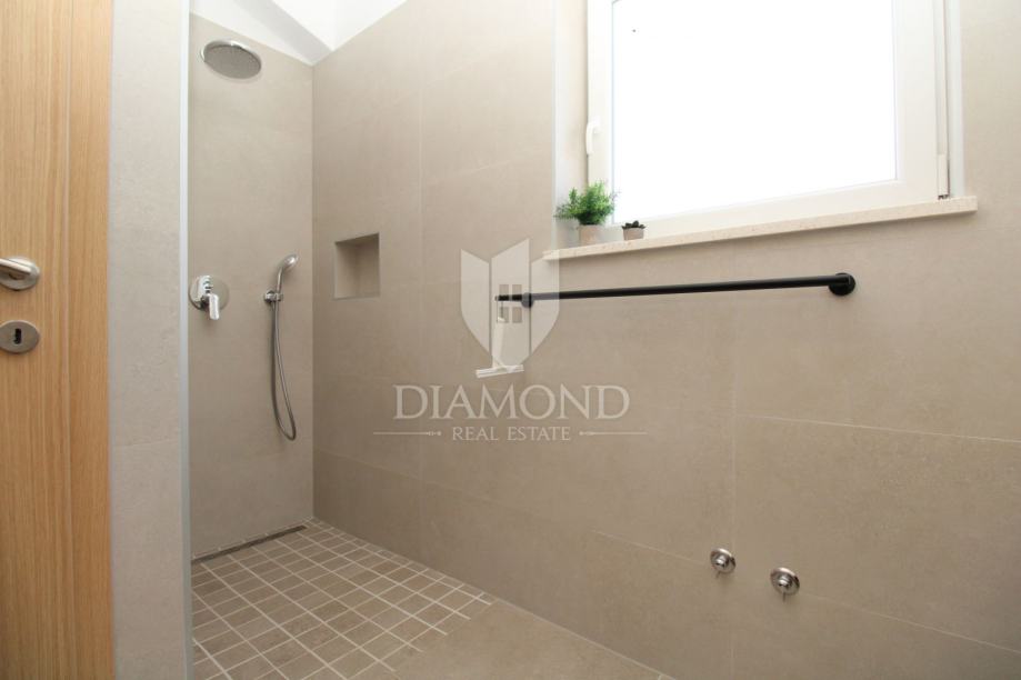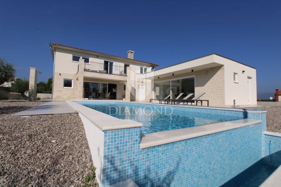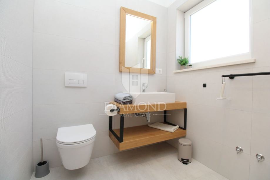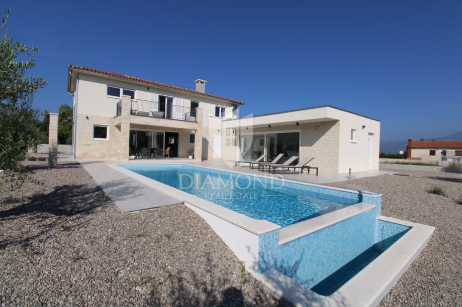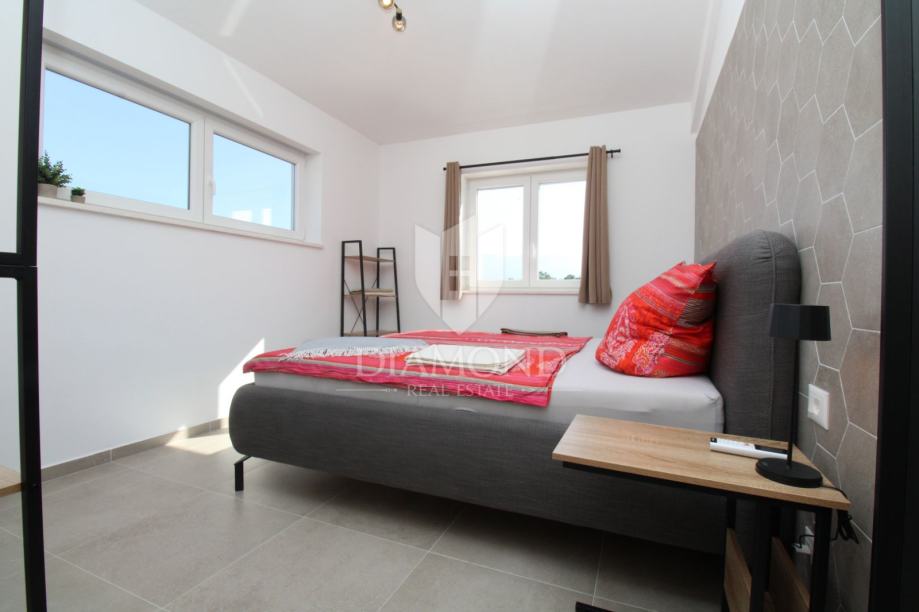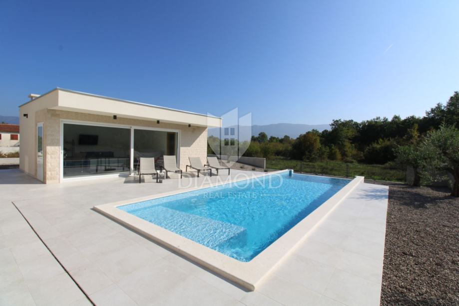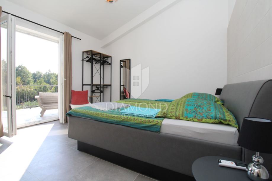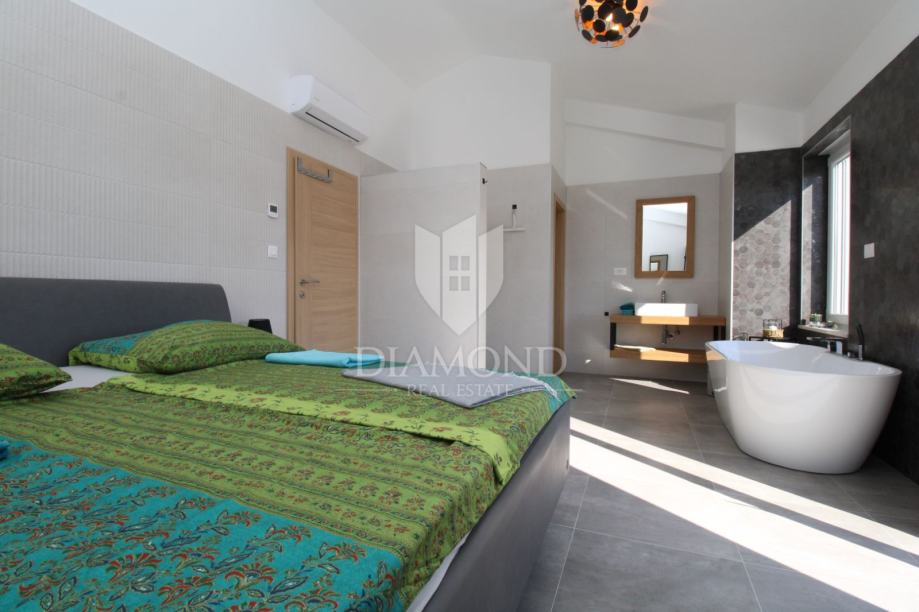 Na rubu manjeg naselja udaljenog od Labina 13 kilometara, prodajemo ovu novoizgrađenu kuću za odmor. Kuća je koncipirana kao katnica ukupne površine 180 m2. Kat predstavlja noćni dio sa tri spavaće sobe i tri kupaonice. Master spavaća soba ima i izlaz na balkon sa lijepim pogledom na bazen i okolno zelenilo. Prizemlje se sastoji od velikog, svijetlog prostora u koji je uklopljena potpuno opremljena kuhinja, blagovaonica i komforan dnevni boravak sa velikim staklenim stijenama kao poveznicama sa vanjskom terasom i plažom bazena. U prizemlju se nalazi i jedan gostinjski toalet te ostava. Interijer je modernog dizajna sa udobnim i funkcionalnim namještajem. U svakoj prostoriji postavljen je klima uređaj a kuća ima i podno grijanje. Postoji mogućnost i ugradnje peći u dnevni prostor.