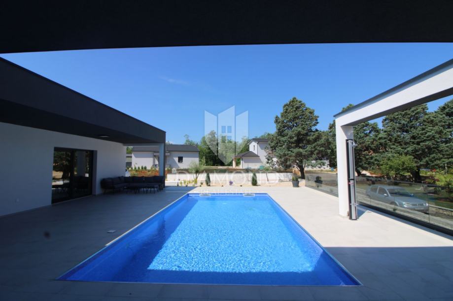 Na parceli veličine 1011 m2 smjestila se ova novoizgrađena kuća za odmor s bazenom. Kuća je ukupne površine 187.40 m2, koncipirana je kao prizemnica a sastoji se od tri spavaće sobe sa vlastitim kupaonicama, gostinjskog toaleta te open space prostor koji objedinjuje kuhinju, blagovaonicu i dnevni boravak sa velikim staklenim stijenama koje osiguravaju dovoljno prirodnog svjetla i prozračnost prostora. Dnevni prostor povezan je direktno sa vanjskom natkrivenom terasom i plažom bazena. Zasebni ulaz izvana imaju praonica i tehnička soba.