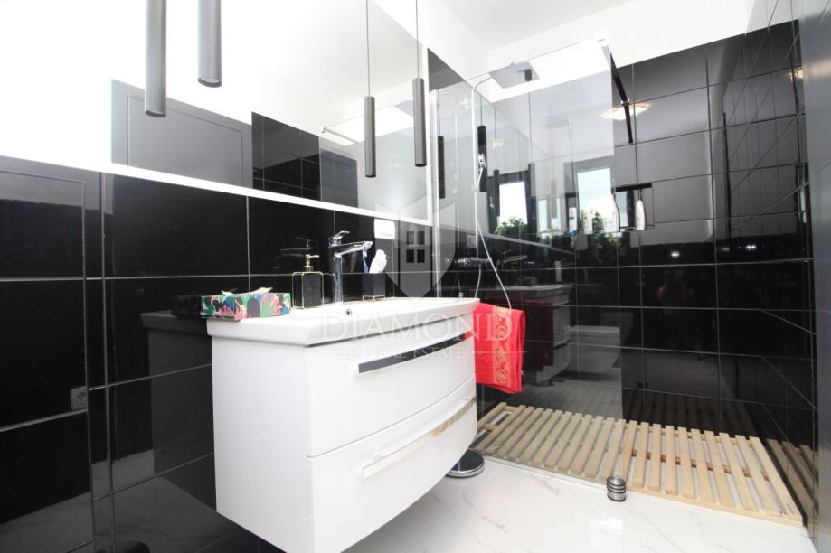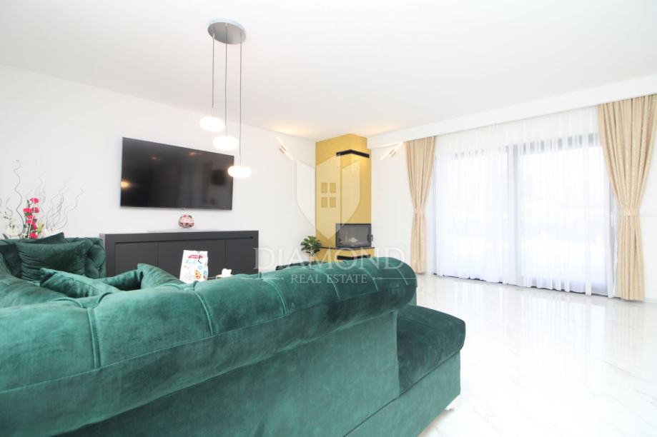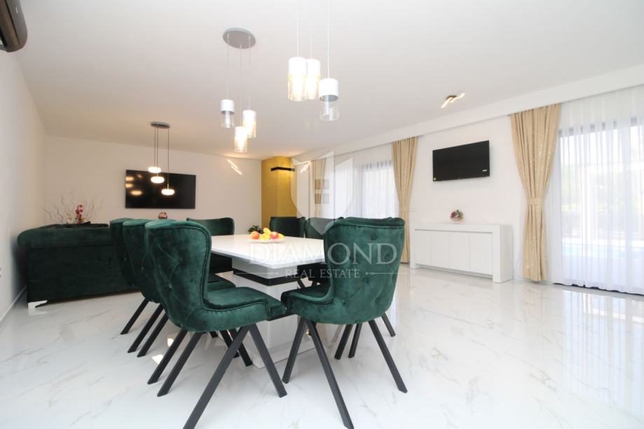 Prostrana okućnica osigurava komociju - dovoljno zelenih površina, parking za dva automobila a centar pozornosti svakako zauzima grijani bazen sa slanom vodom veličine 32 m2.