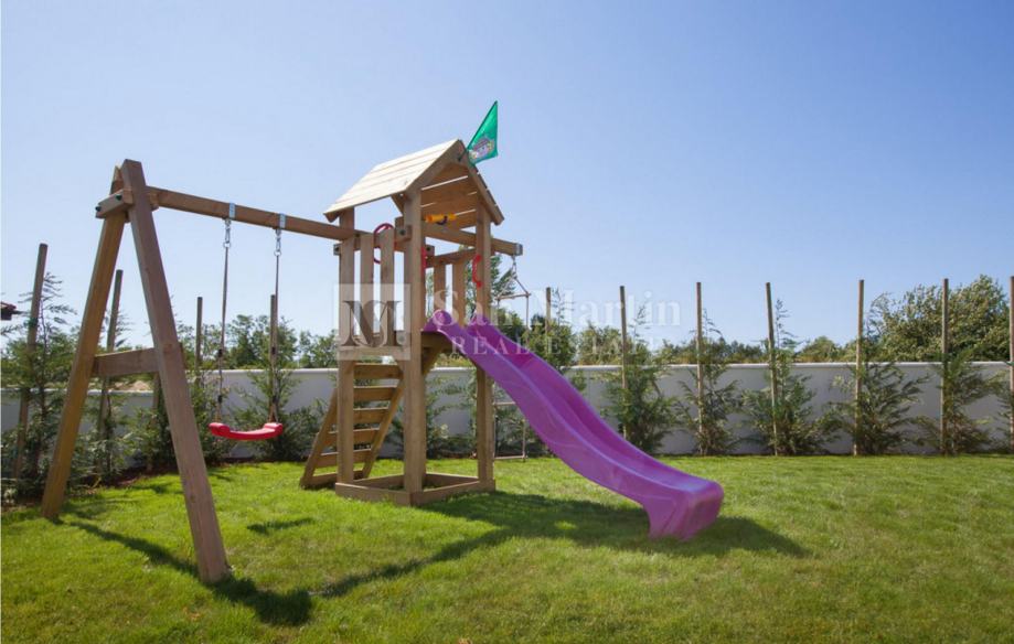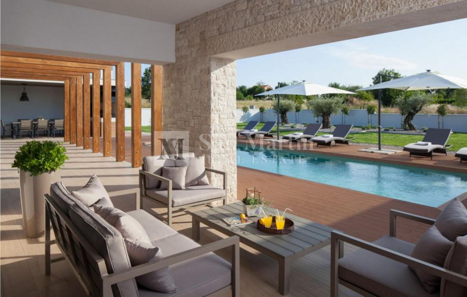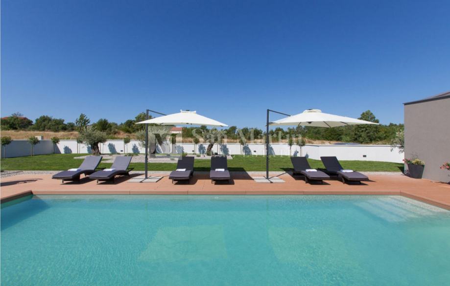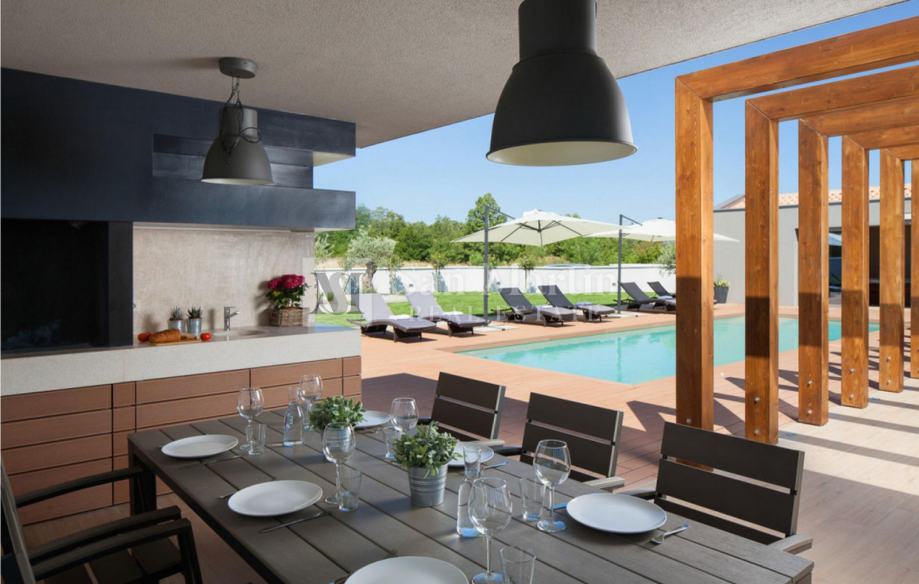 Dnevni prostor kuće ima izlaz na natkrivenu terasu koja vodi u njegovani vrt u koje su se smjestili prostrani bazen sa zonom za sunčanje te ljetna kuhinja.