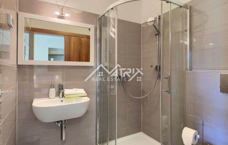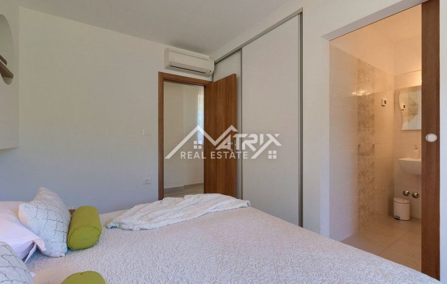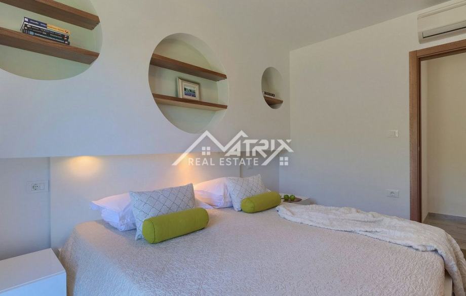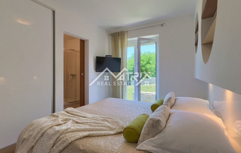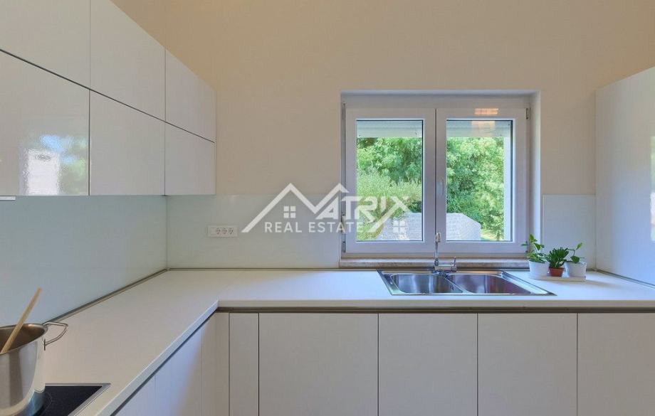 Kuća se prostire kroz jednu etažu čiji je centralni dio prostrani open space prostor obuhvaća kuhinju, blagovaonicu i dnevni boravak, koji ima direktan pristup velikoj terasi bazena sa sunčalištem, savršenoj za opuštanje i uživanje u suncu i toplini. U kući se još nalaze četiri spavaće sobe s vlastitim kupaonicama, a kuća ima i WC za goste.